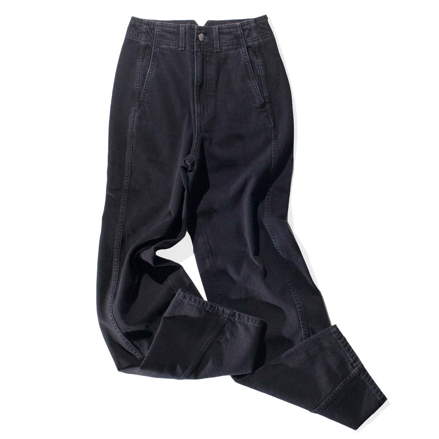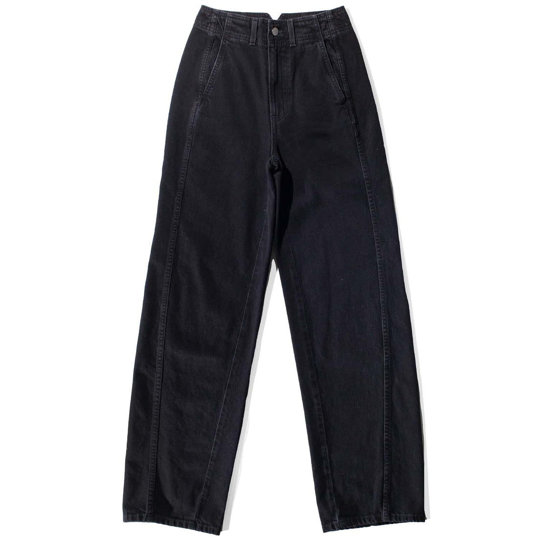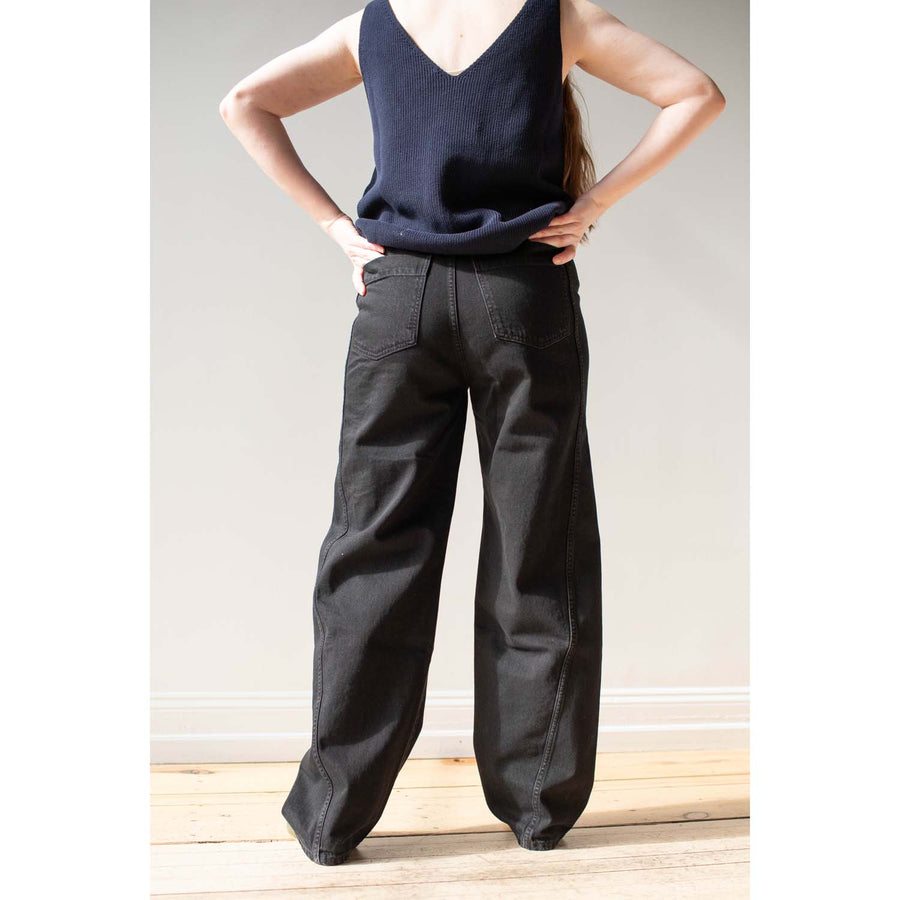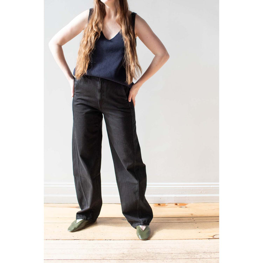 The Meridian Jean is a high-rise jean with a long barrel-leg silhouette.