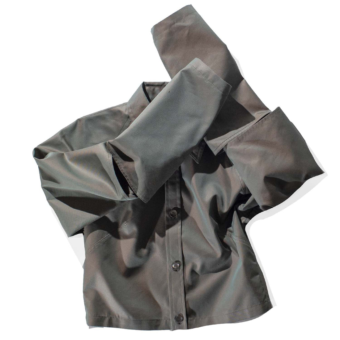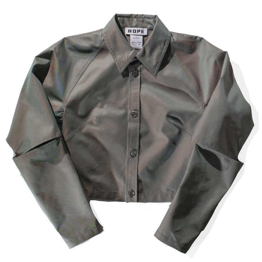 The Matrix Shirt is a cropped button-down shirt with cocoon sleeves that feature cut-outs at the elbow.