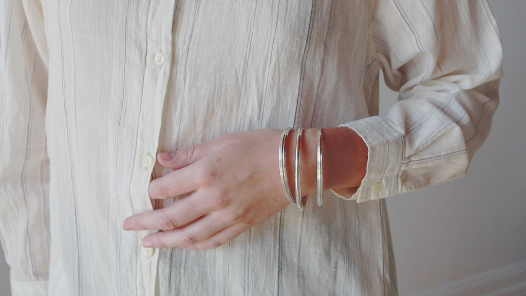 The Simple Tapered Bangle is a weighted oval shape in sterling silver.