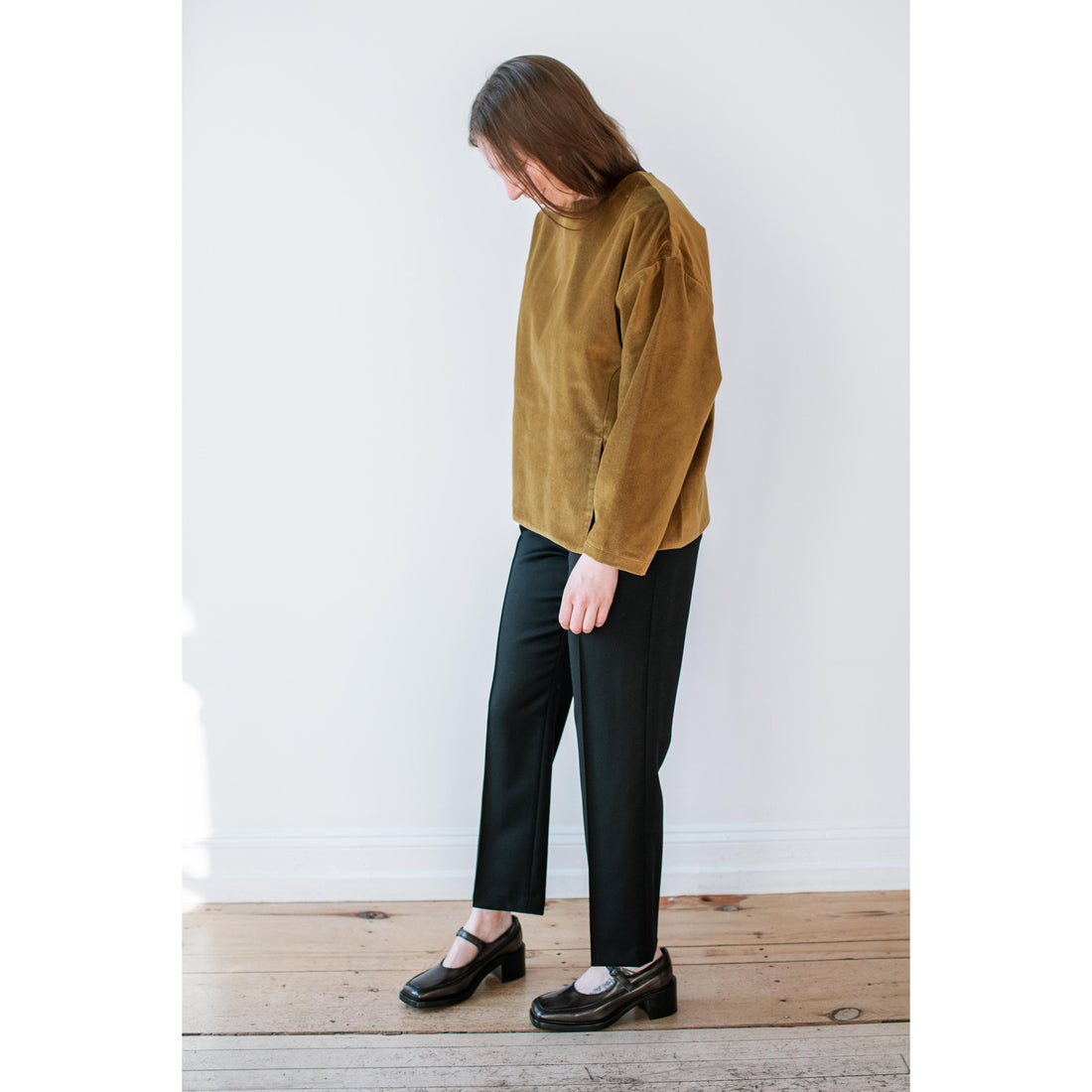 The Helena Pintuck Trouser is a slim relaxed suit pant in black tropical wool.
