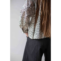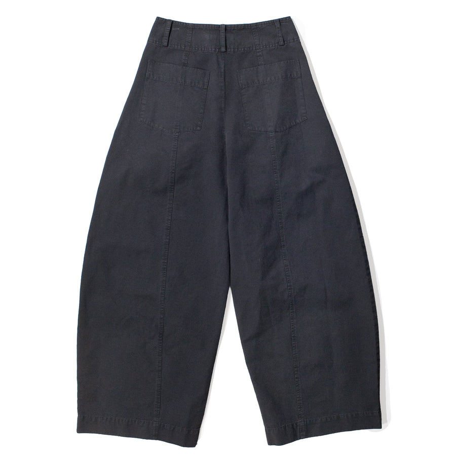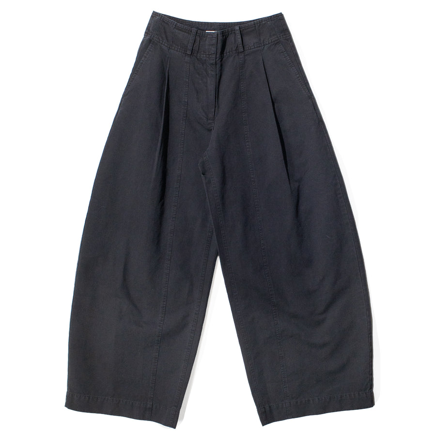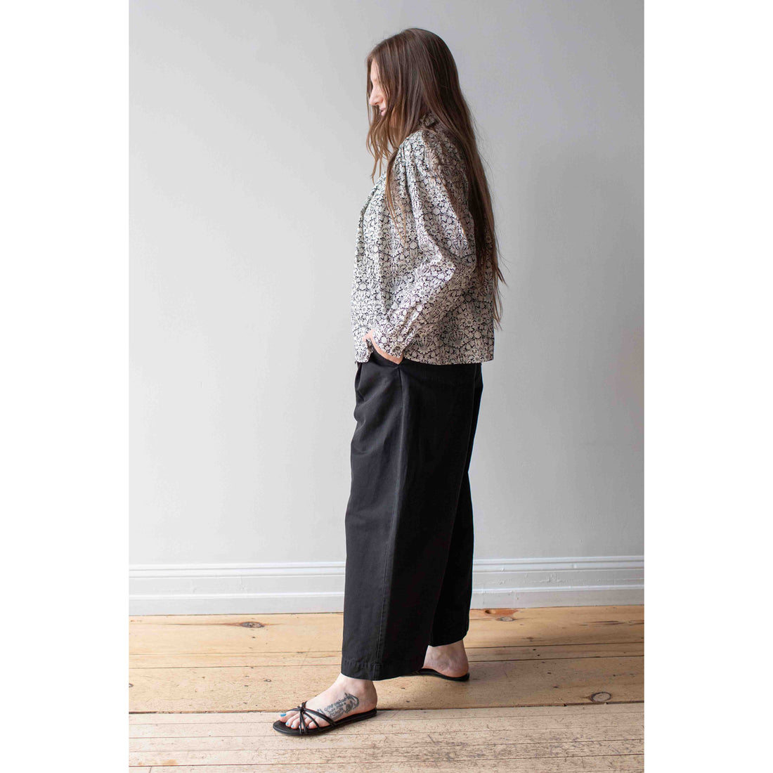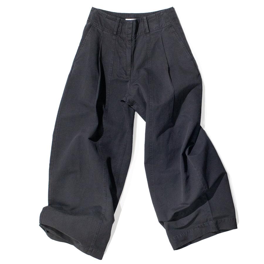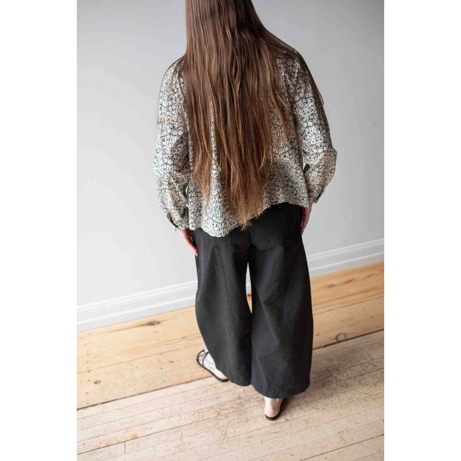 The Cropped Cybil Trouser is a pleated barrel-leg pant crafted from a soft cotton-linen blend.