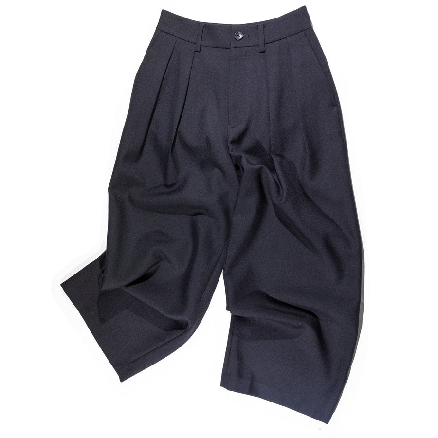 The Vespa Pant is a wide-leg wool trouser with deep double pleats in the front.