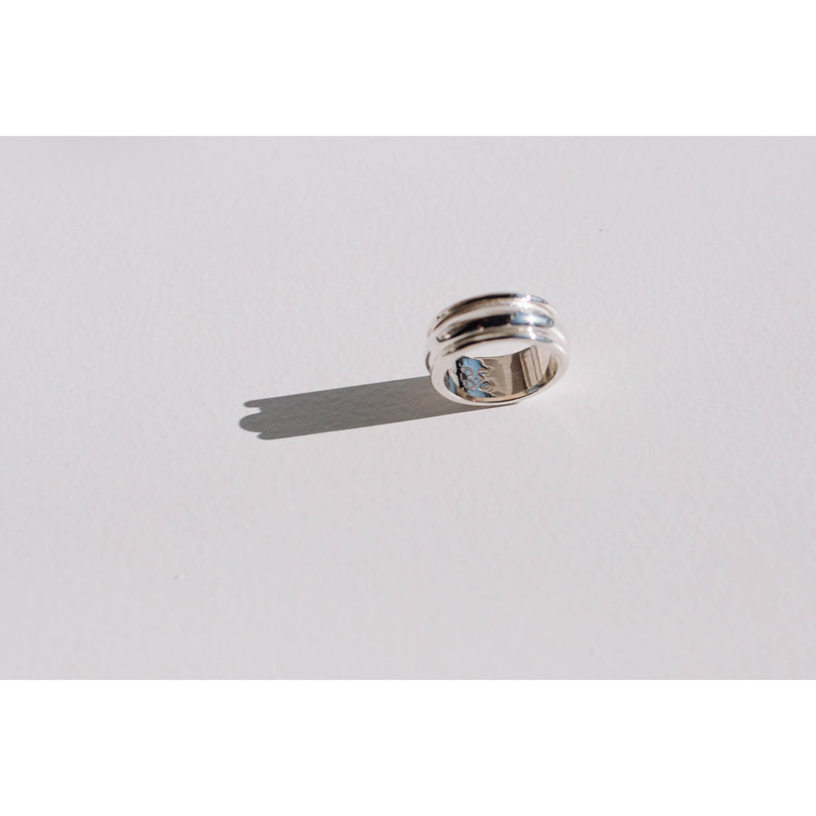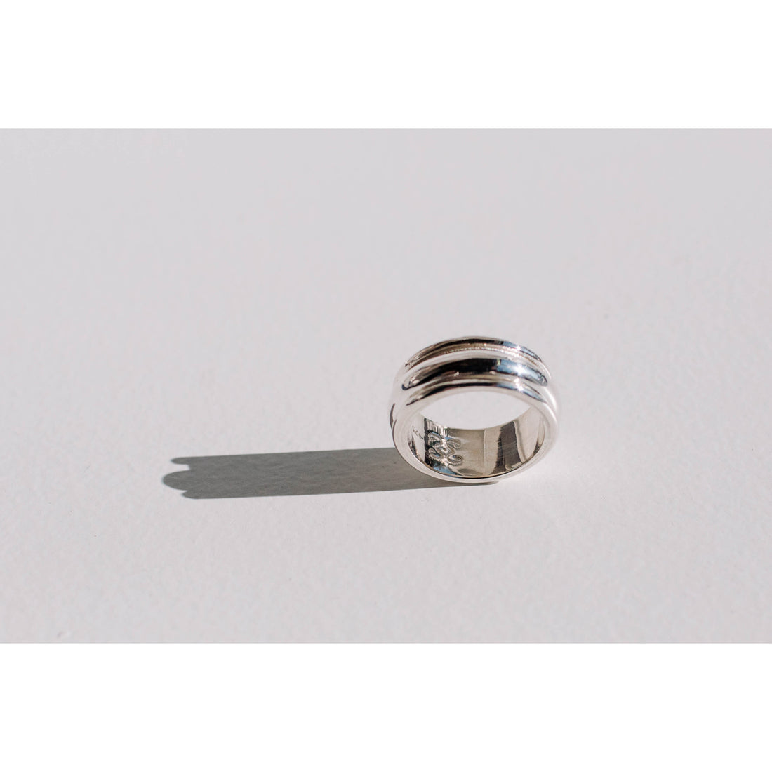 The Monument Spinner Ring is a sterling silver band with grooved details.