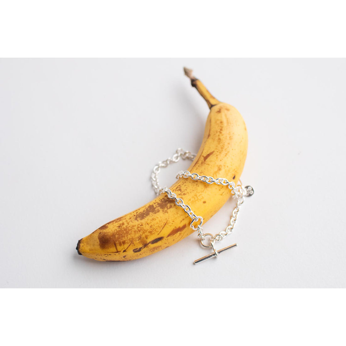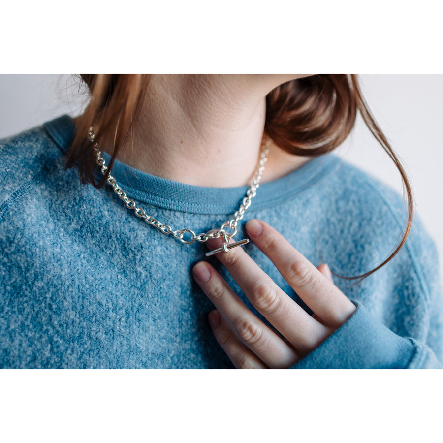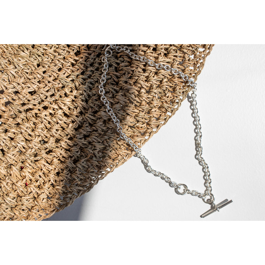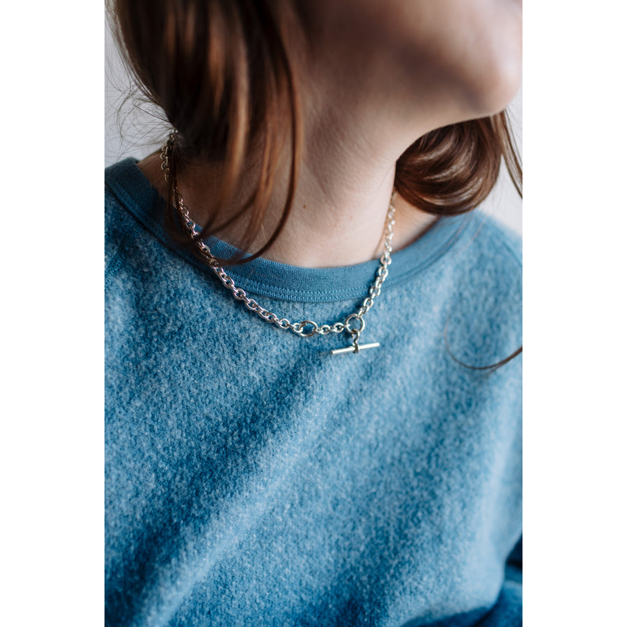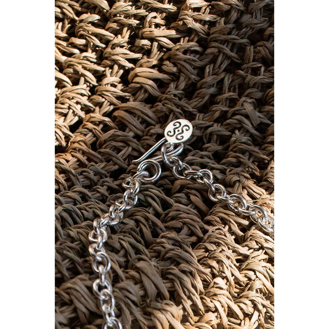 The Two Moons Necklace is a symbolic reinterpretation of a classic. A decorative custom-made toggle hangs from one of two unique circle elements, bringing to mind the changing phases of the moon.