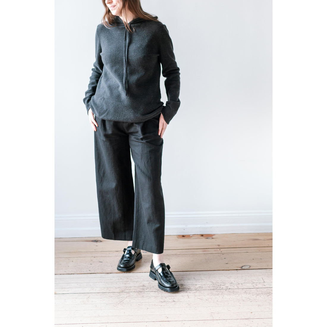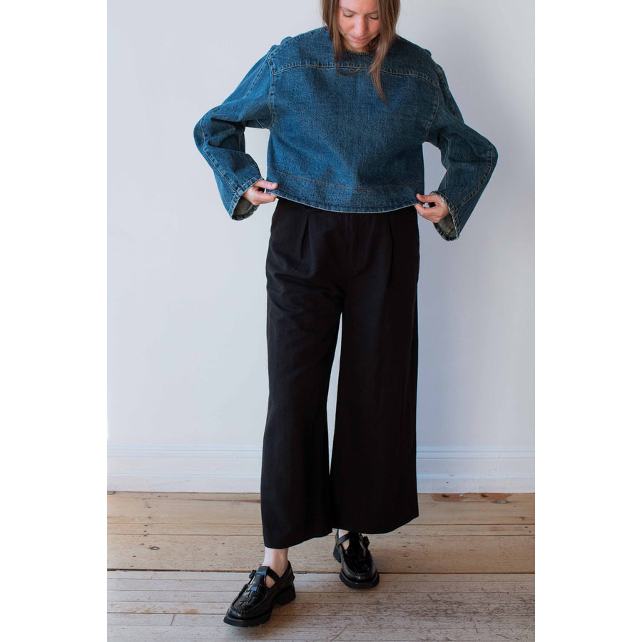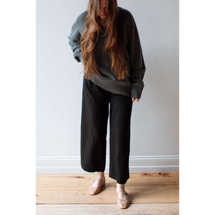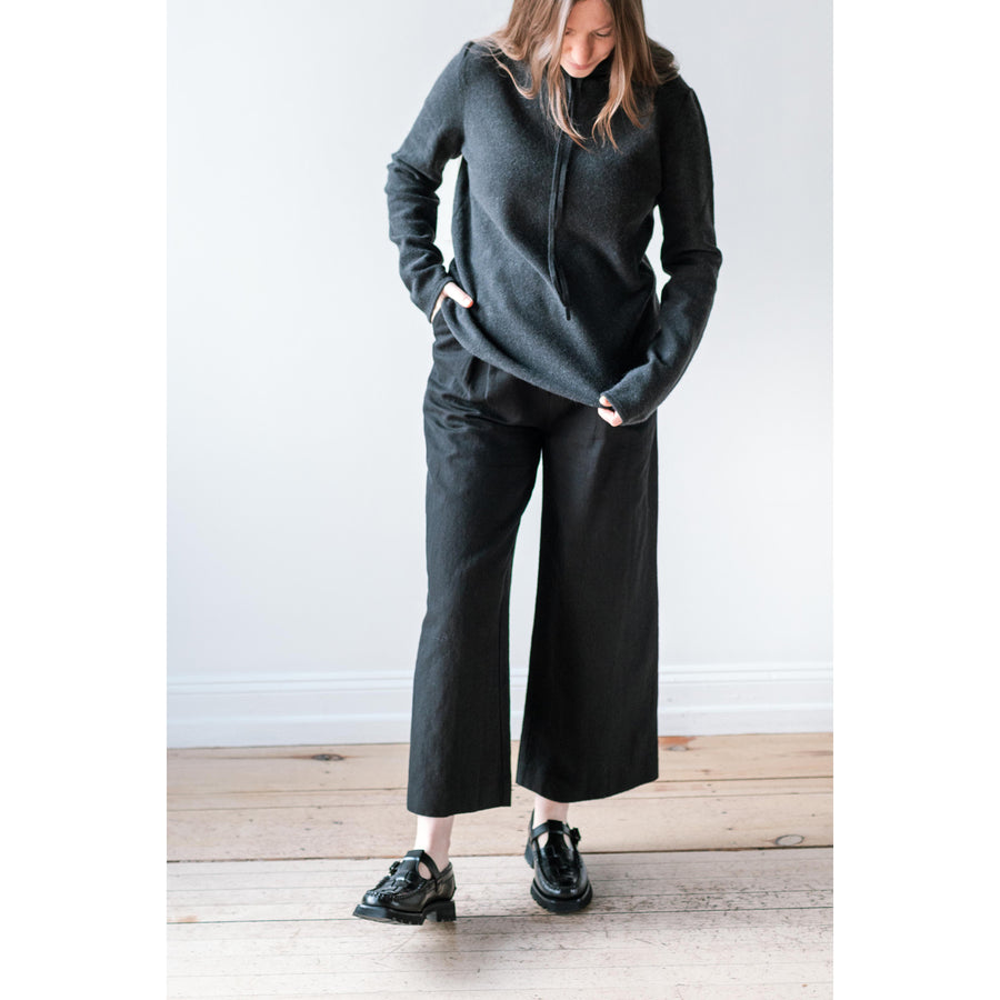 The Cara is a cropped wide-leg trouser with front pleats, cut this season in a soft linen/cotton blend.