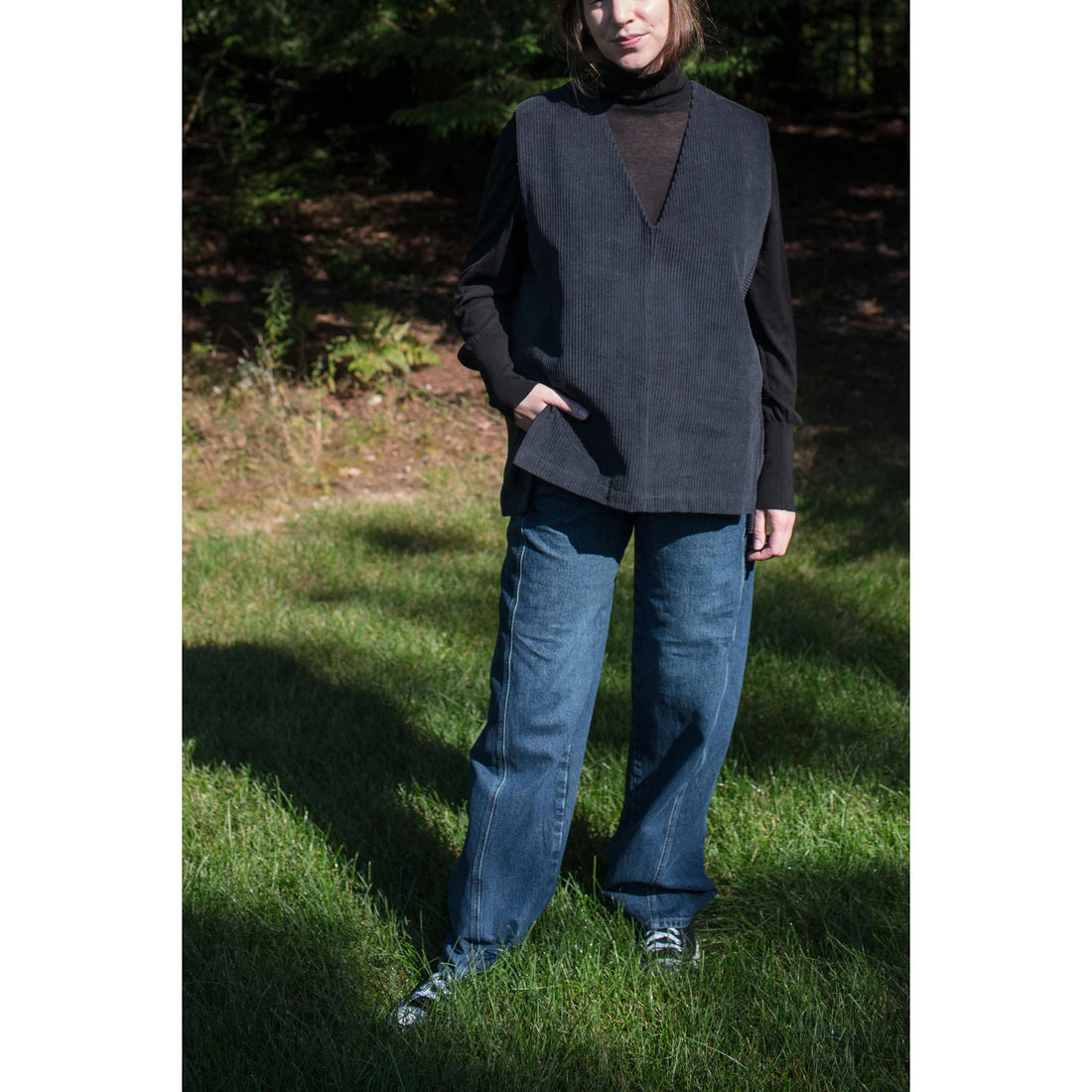The Meridian Jean is a high-rise jean with a long barrel-leg silhouette.