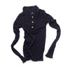A fine-knit ribbed wool top with long sleeves and a polo collar.