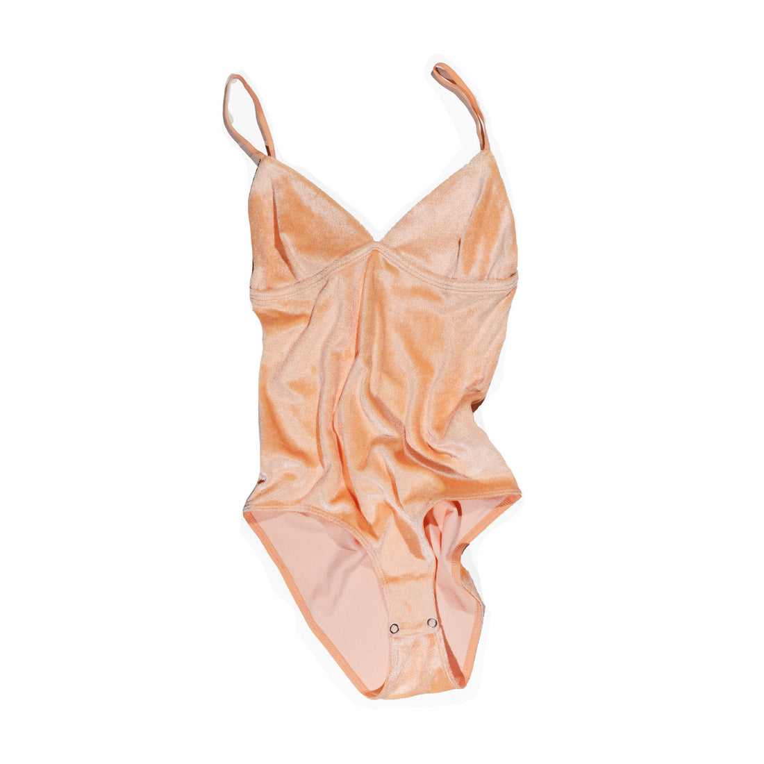 The Mississippi Bodysuit is a shiny velour bodysuit with triangle cups, adjustable elastic straps, and snap closures.
