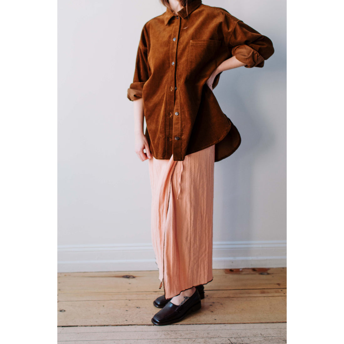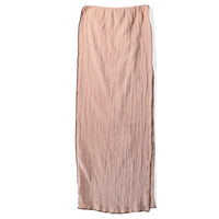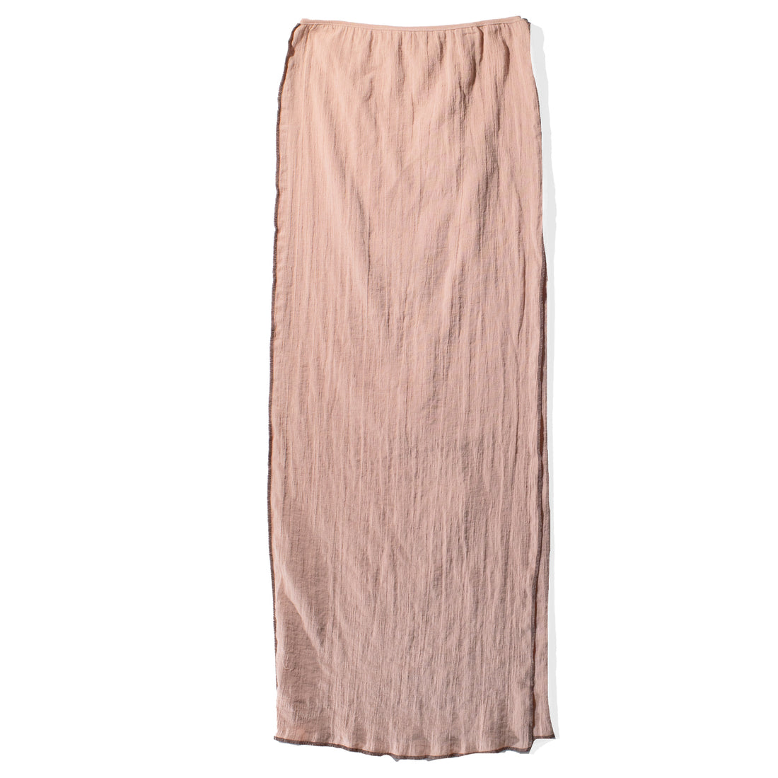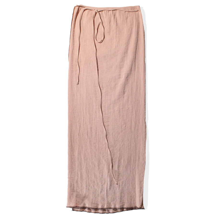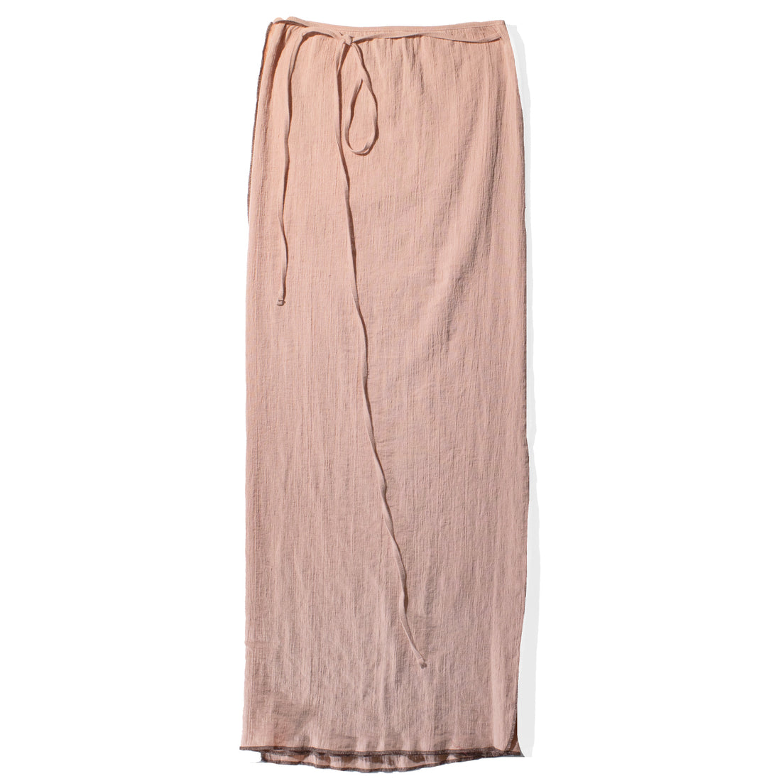 The Shok Wrap Skirt is a long linen silhouette with exposed contrast seams.