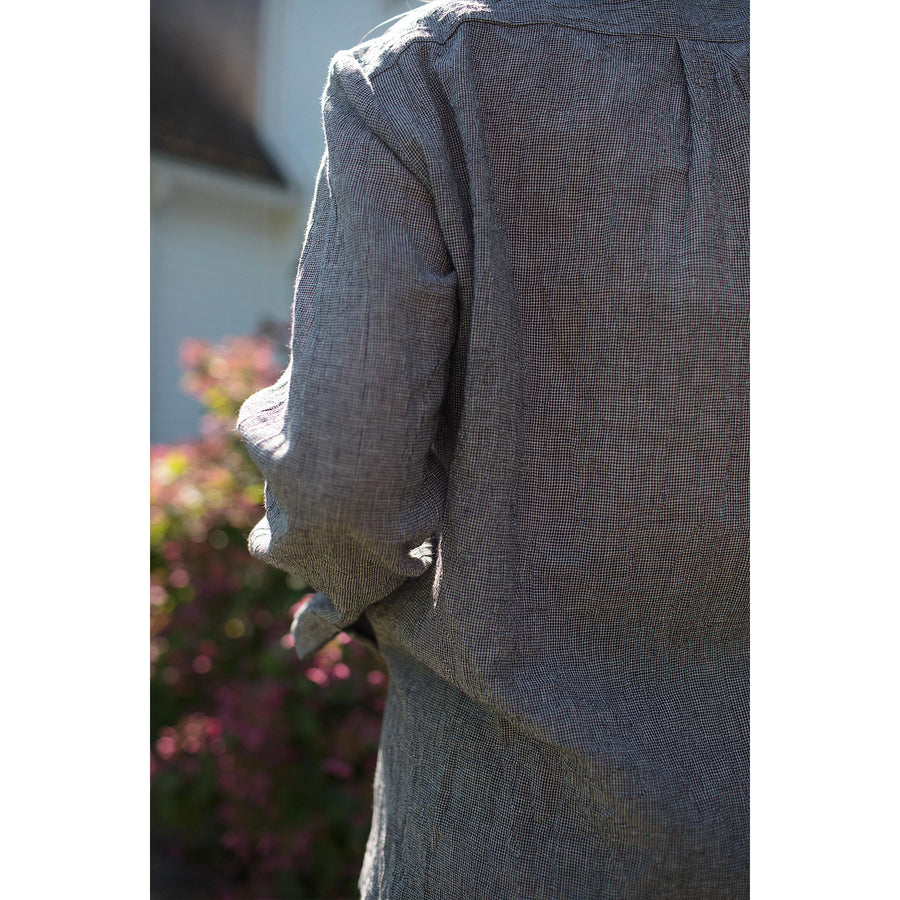 The Borges Blouse is a classic button-down style with a petite collar in cotton-linen wrinkled plaid.