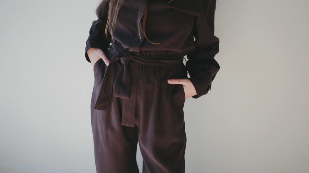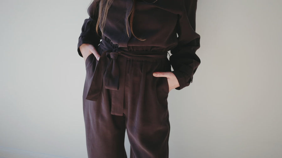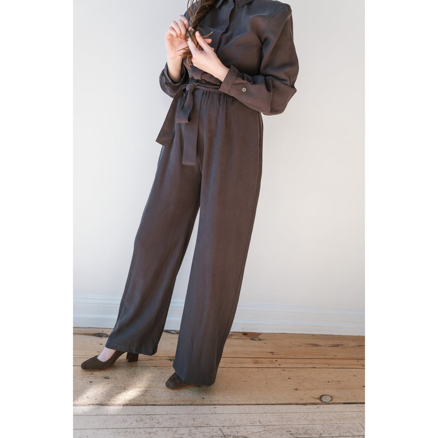 The Gentlewoman Jumpsuit is a full-length silhouette with an elastic waistband, waist-tie belt, and fitted sleeve cuffs.