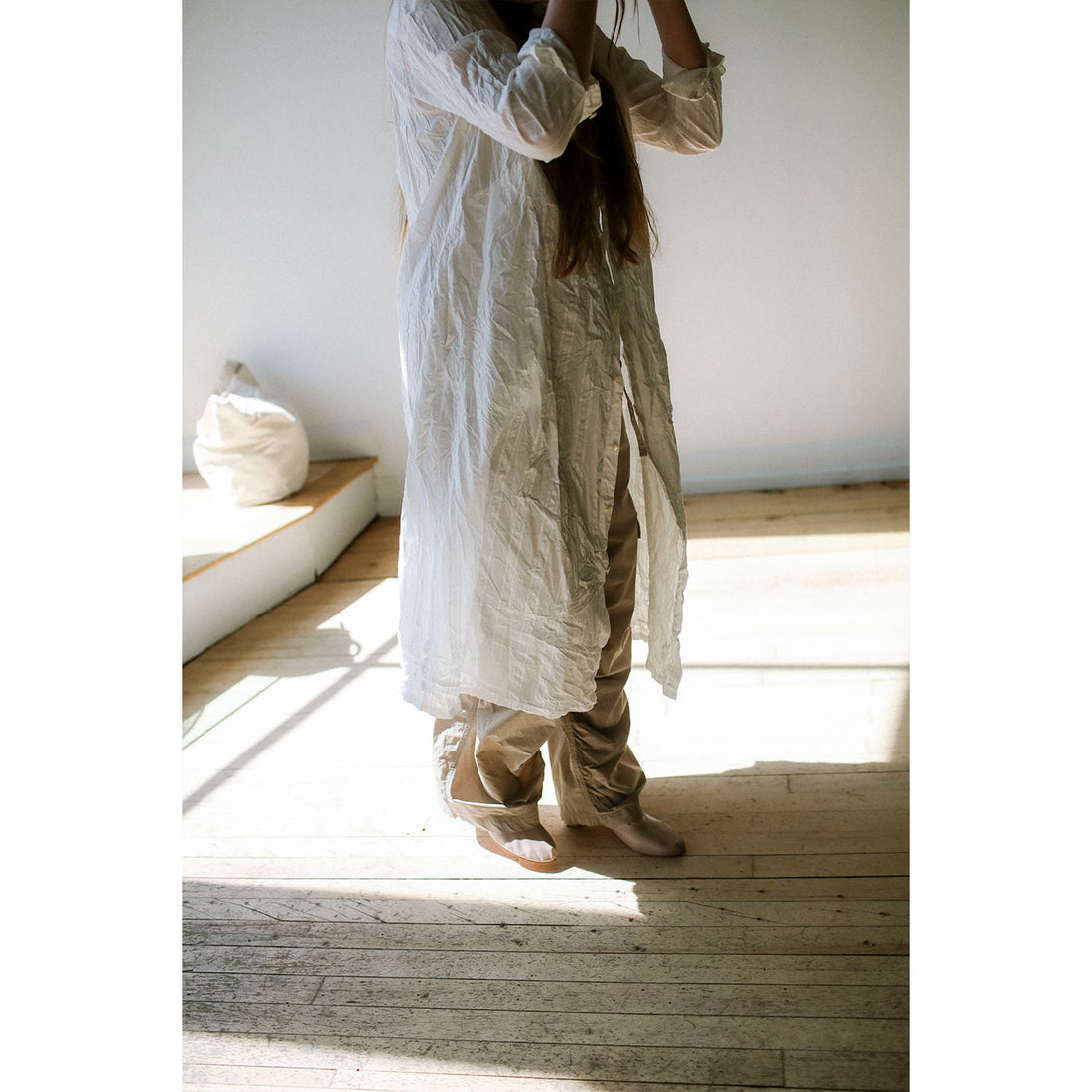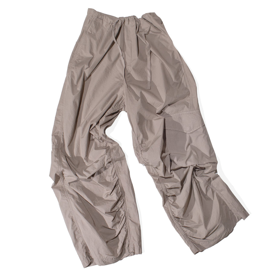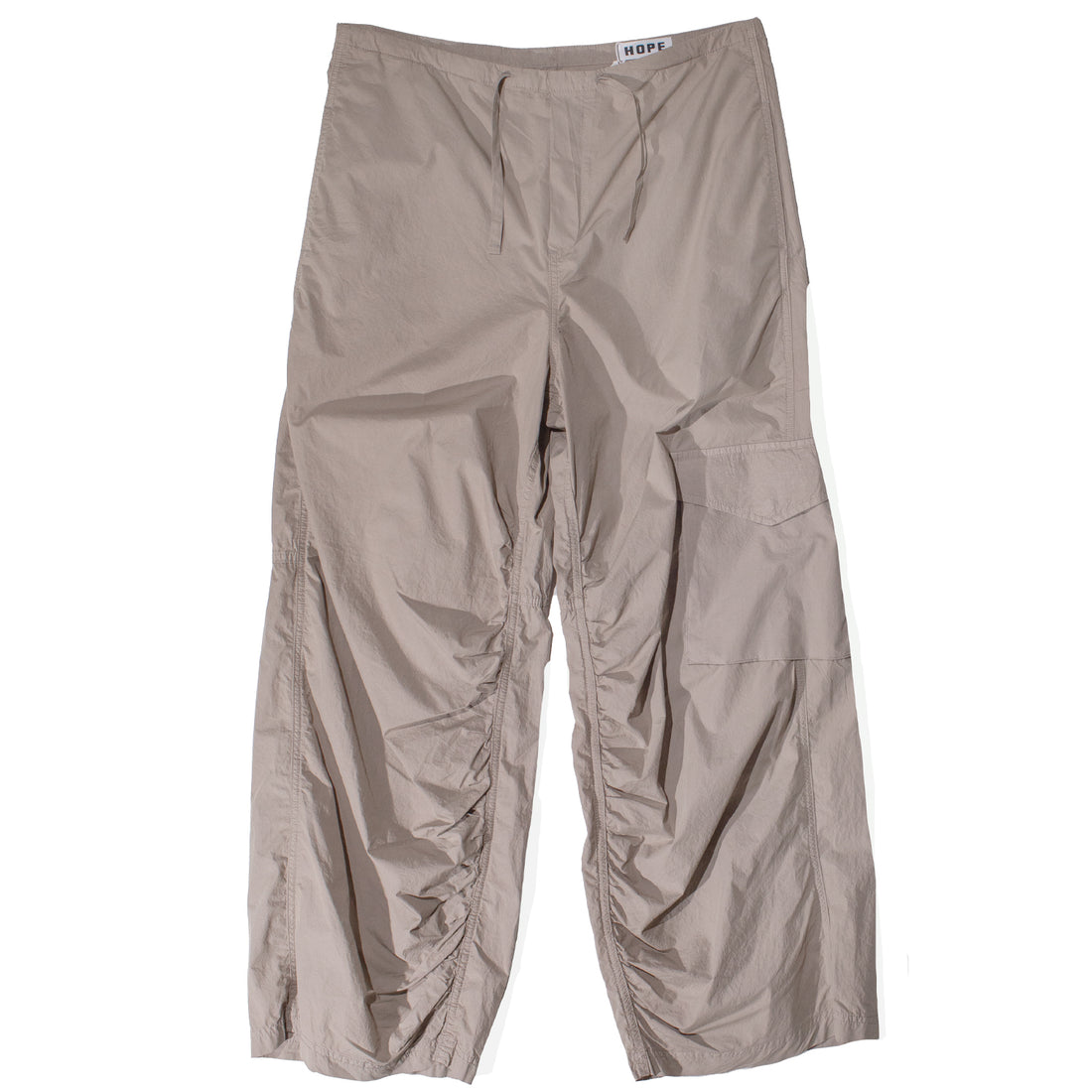 The Collapse Trousers are loose fit trousers crafted from crisp cotton poplin. They feature a drawstring waist, a cargo pocket at the side, and ruching at the inseam.