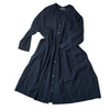 The Random Stripe Dress is a voluminous silhouette with a v-neckline, button-front placket, and empire waistline with gathers.