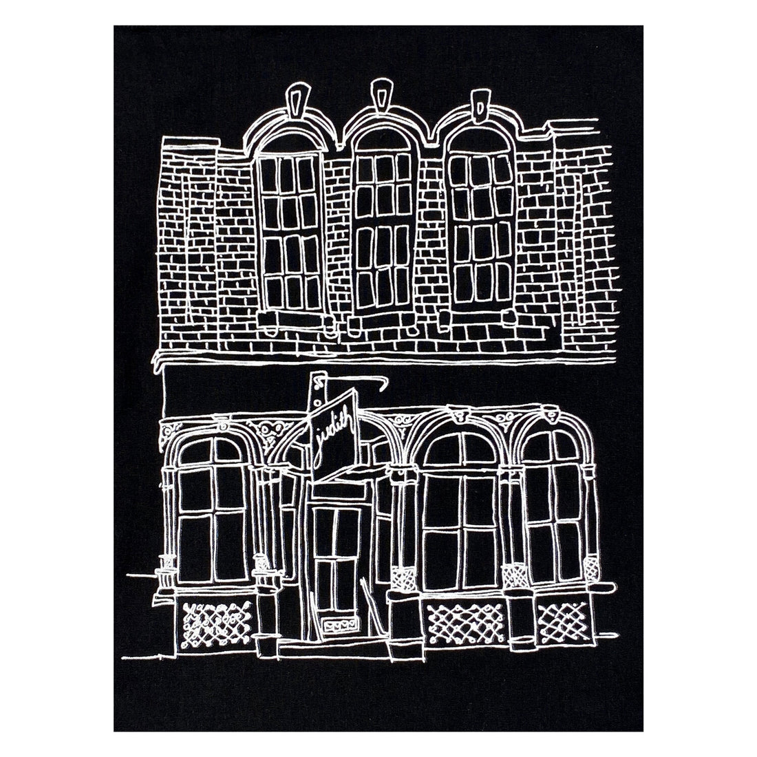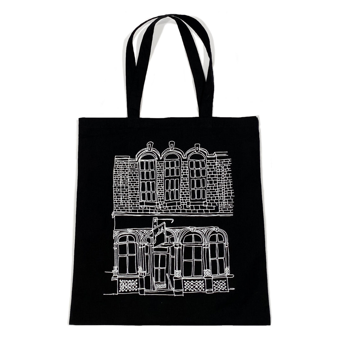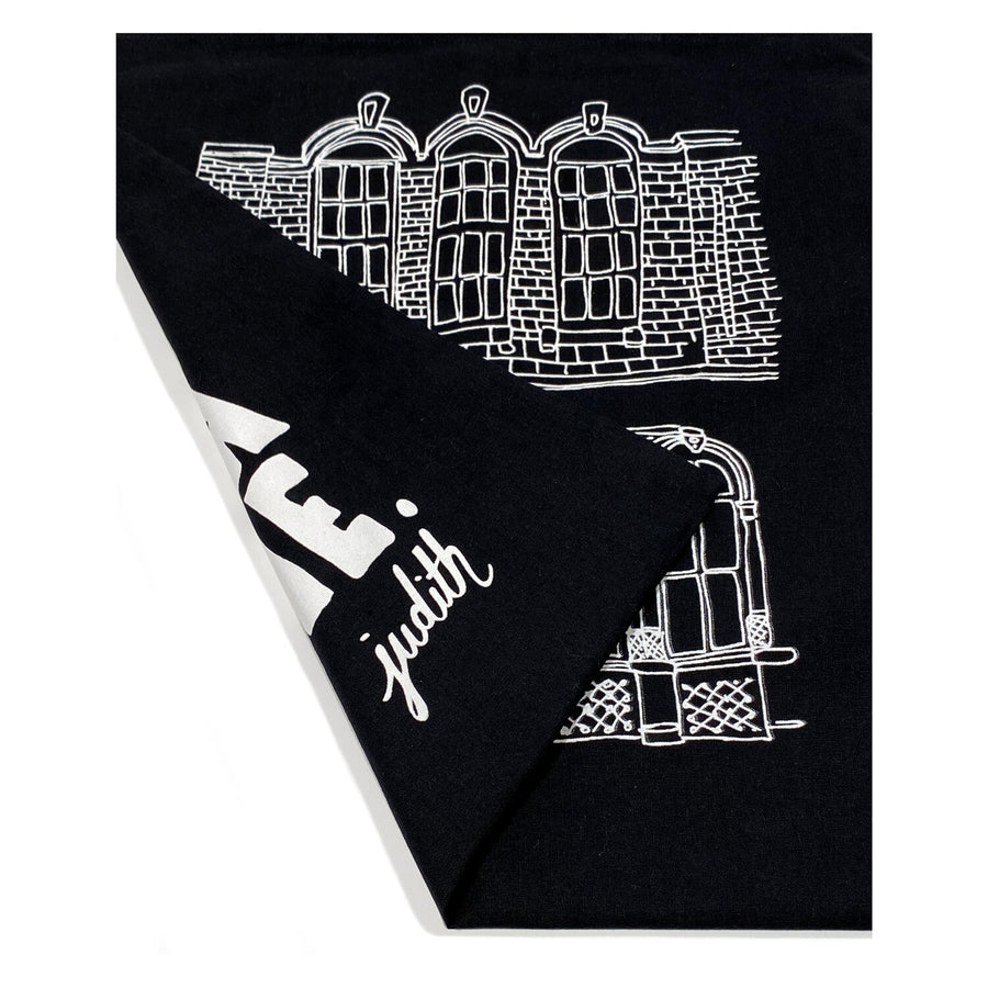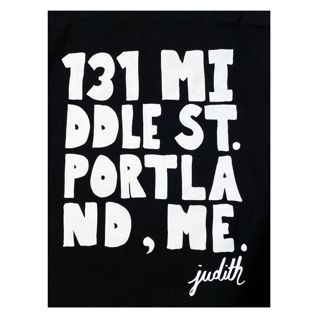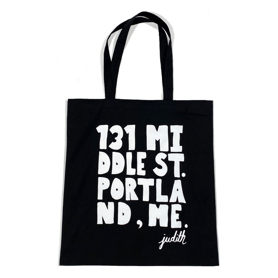 The JUDITH Anniversary tote bag features Hawes’ drawing of the historic facade of our storefront at 131 Middle Street where we’ve been since April 2018, and the reverse has his hand lettering of our address and logo.