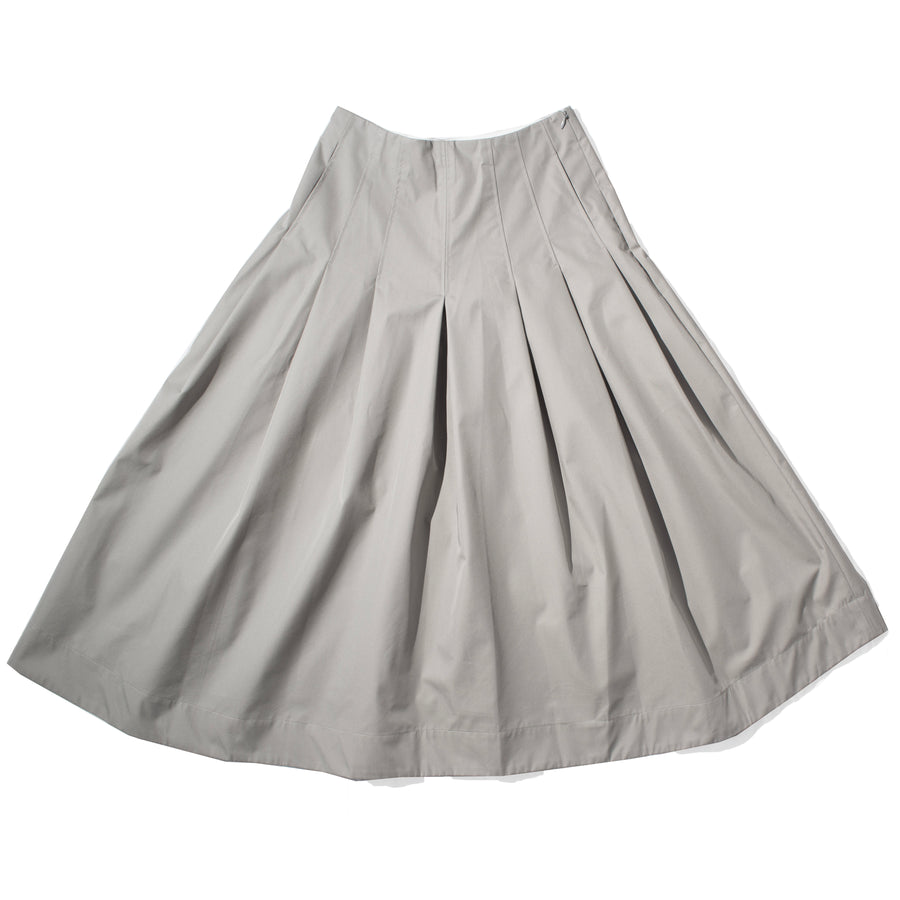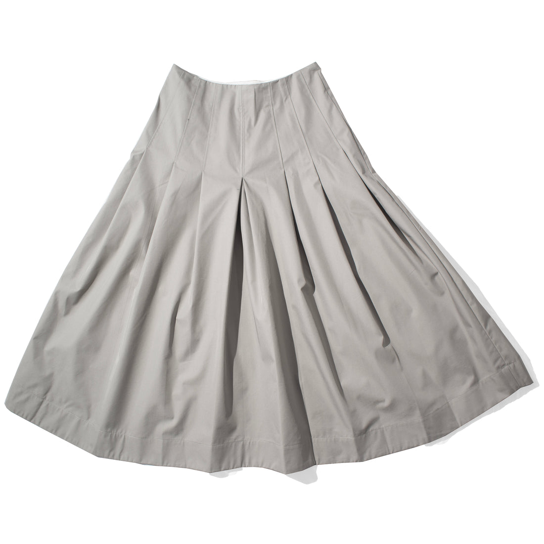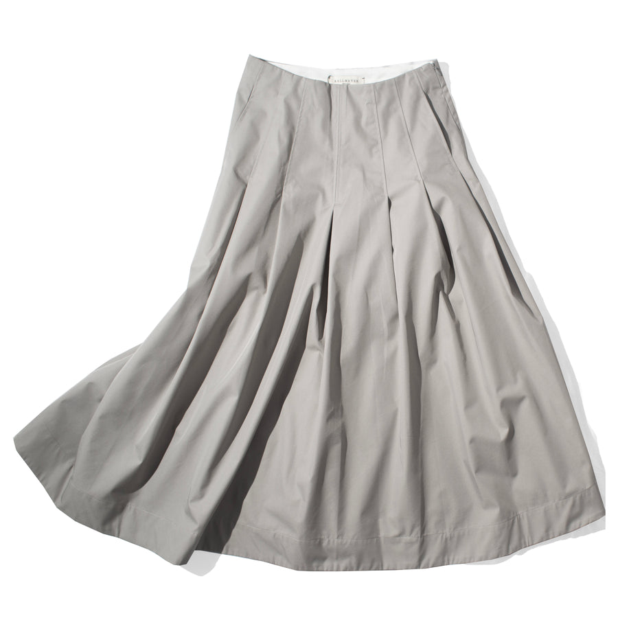 The Dakota is a voluminous pleated midi skirt made from compact cotton and designed to sit below the natural waist.