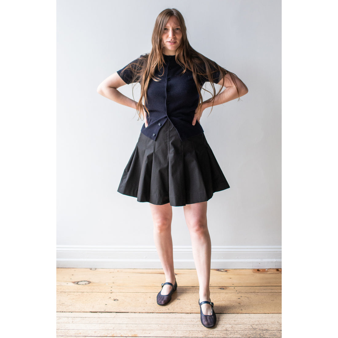 The Sutton is a voluminous, above-knee skirt cut in compact cotton. Designed to sit just below the natural waist, the garment features hidden pockets underneath the front pleat construction.