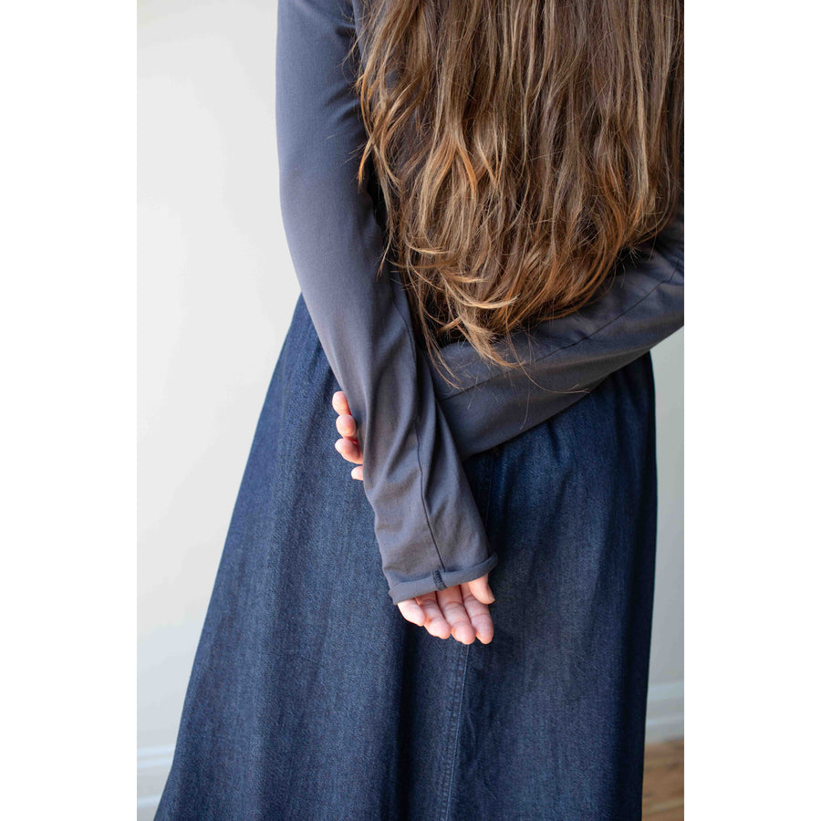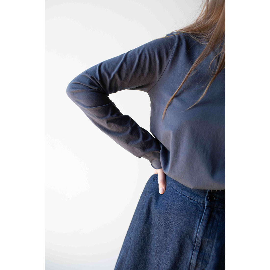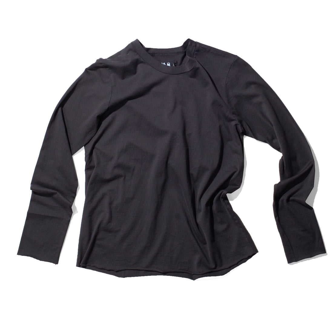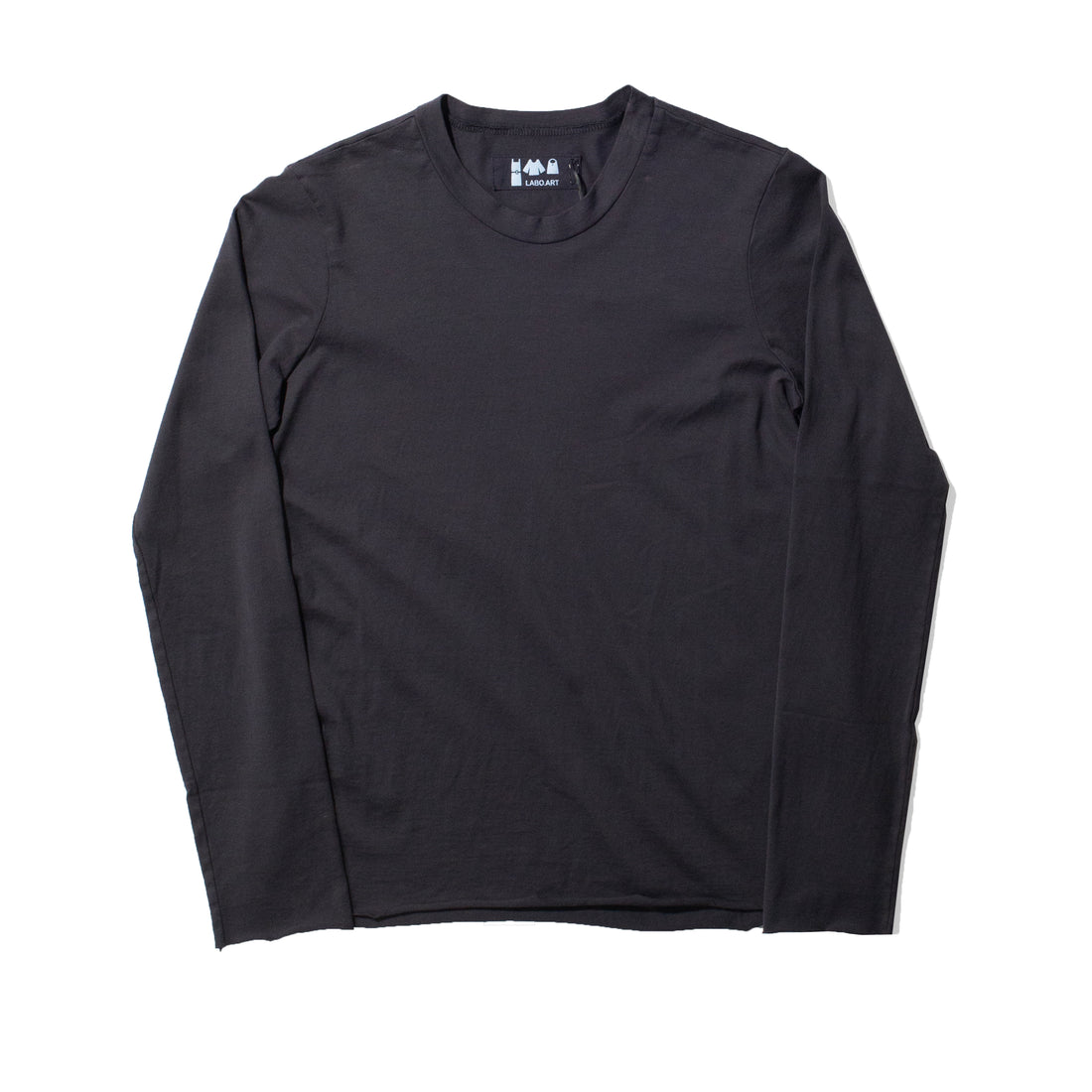 The Agapi Tee is a long sleeve crewneck tee with a rolled hem and cuff.