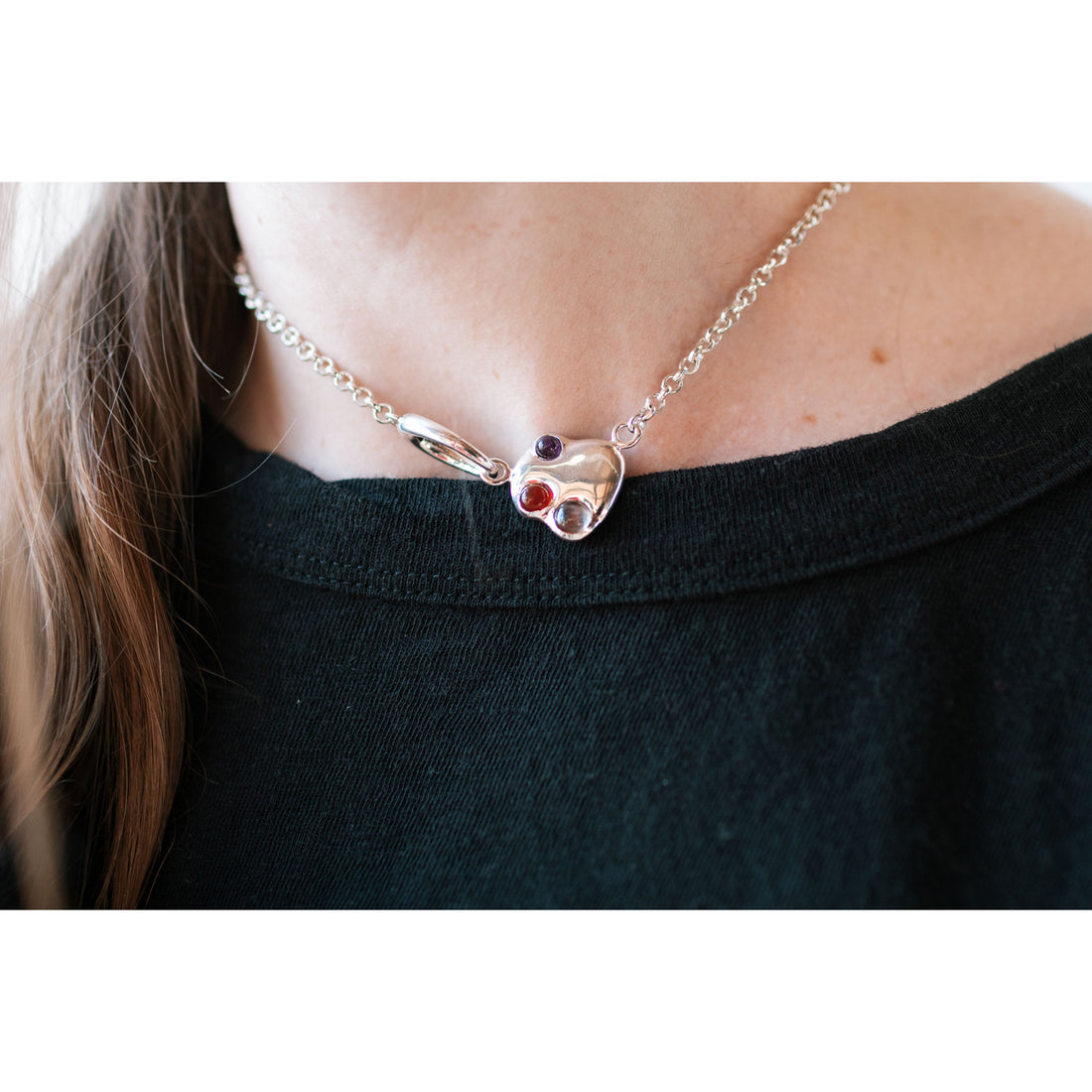 Inspired by rocks at the water’s edge, the Pebble Choker features striped sunstone, amethyst, and carnelian cabochons on a sterling silver pendant.