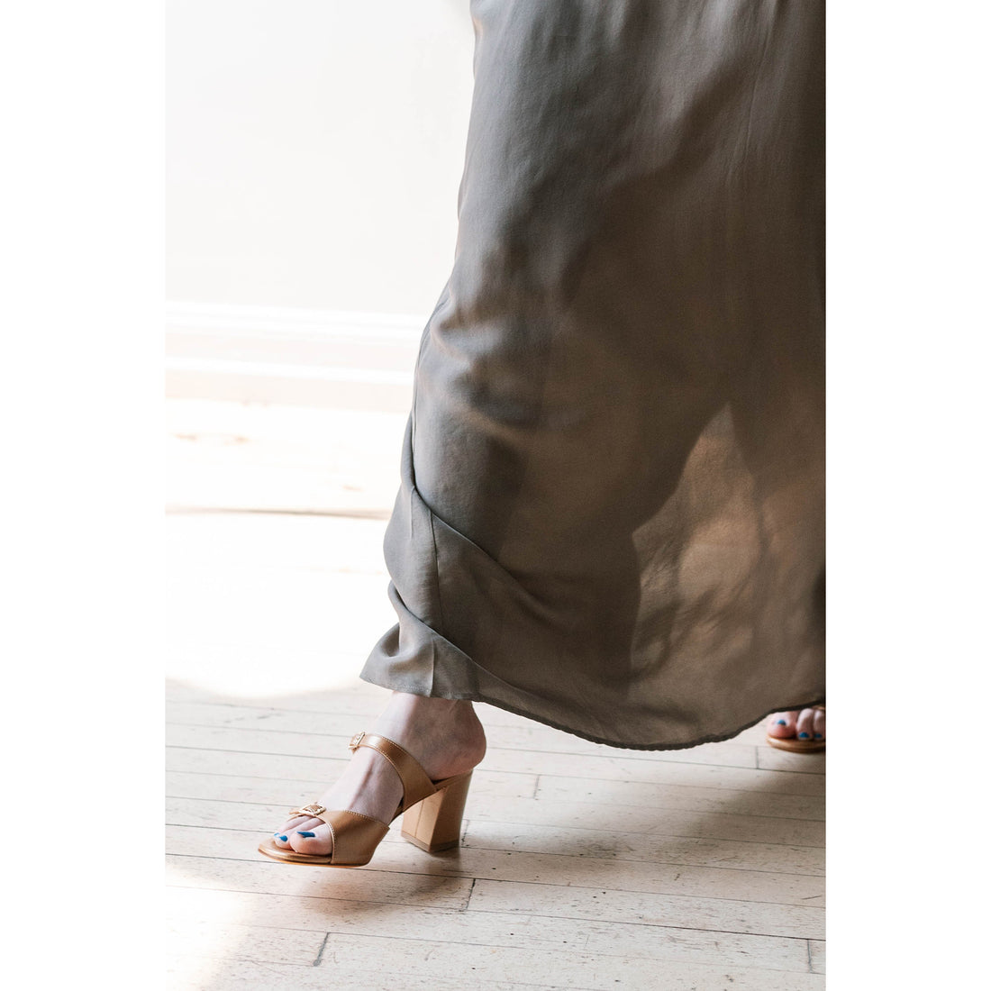 The Una Sandal is a vintage-inspired high heel with two straps with buckle fastenings.