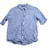 The Blue Shirring Stripe Blouse is a short-sleeve button-down top made from lightweight cotton. A fitted silhouette with a crinkled texture that will continue to change with wear.