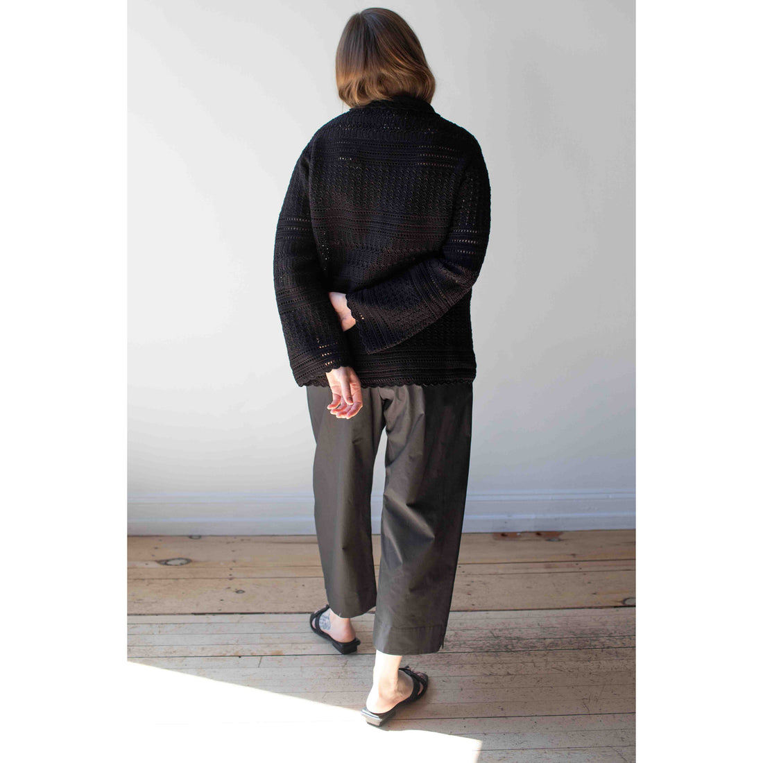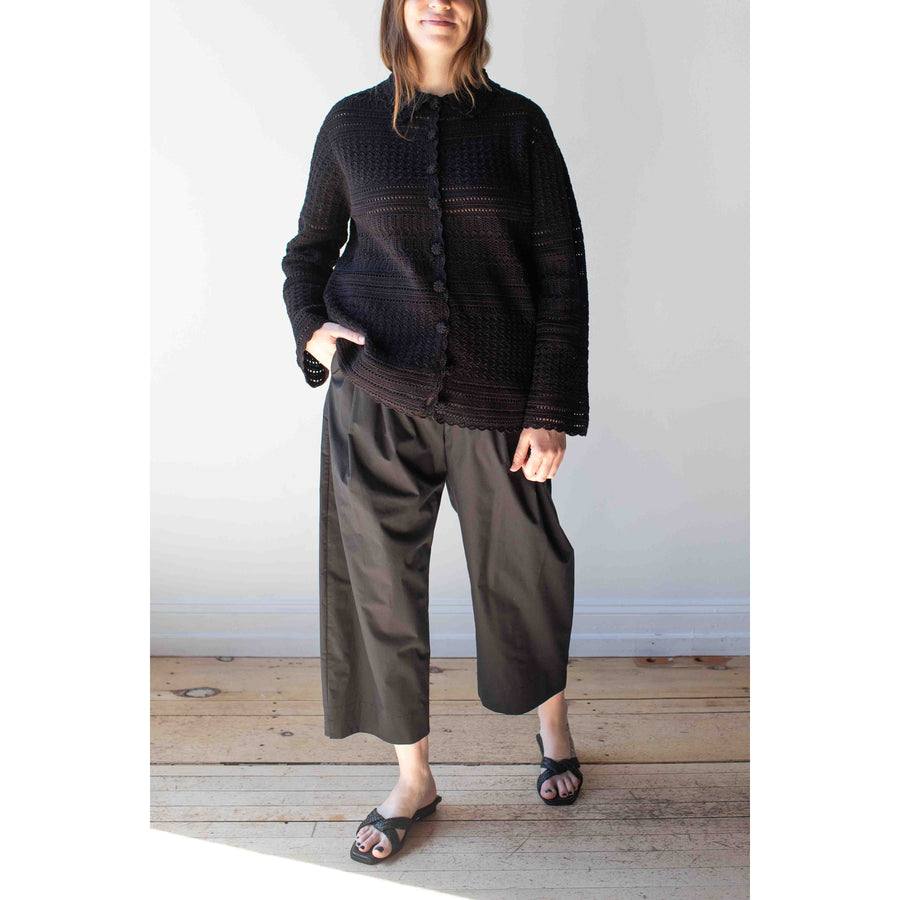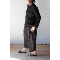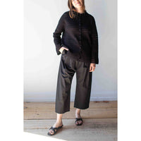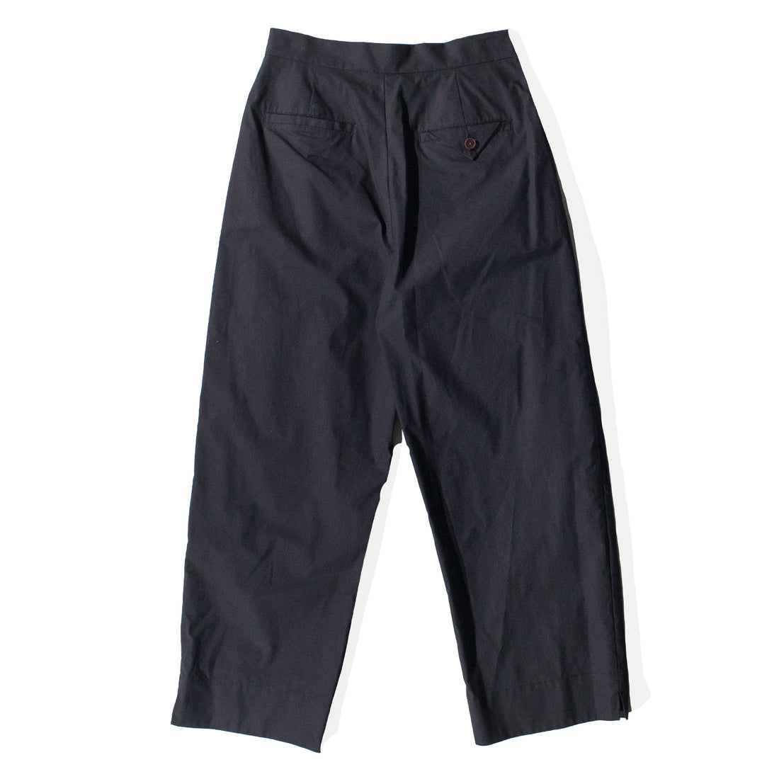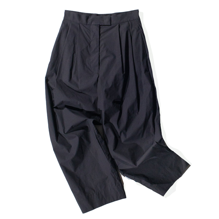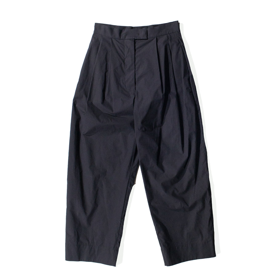 The Babar Pant is a cotton poplin trouser with a curved leg shape and front pleats.