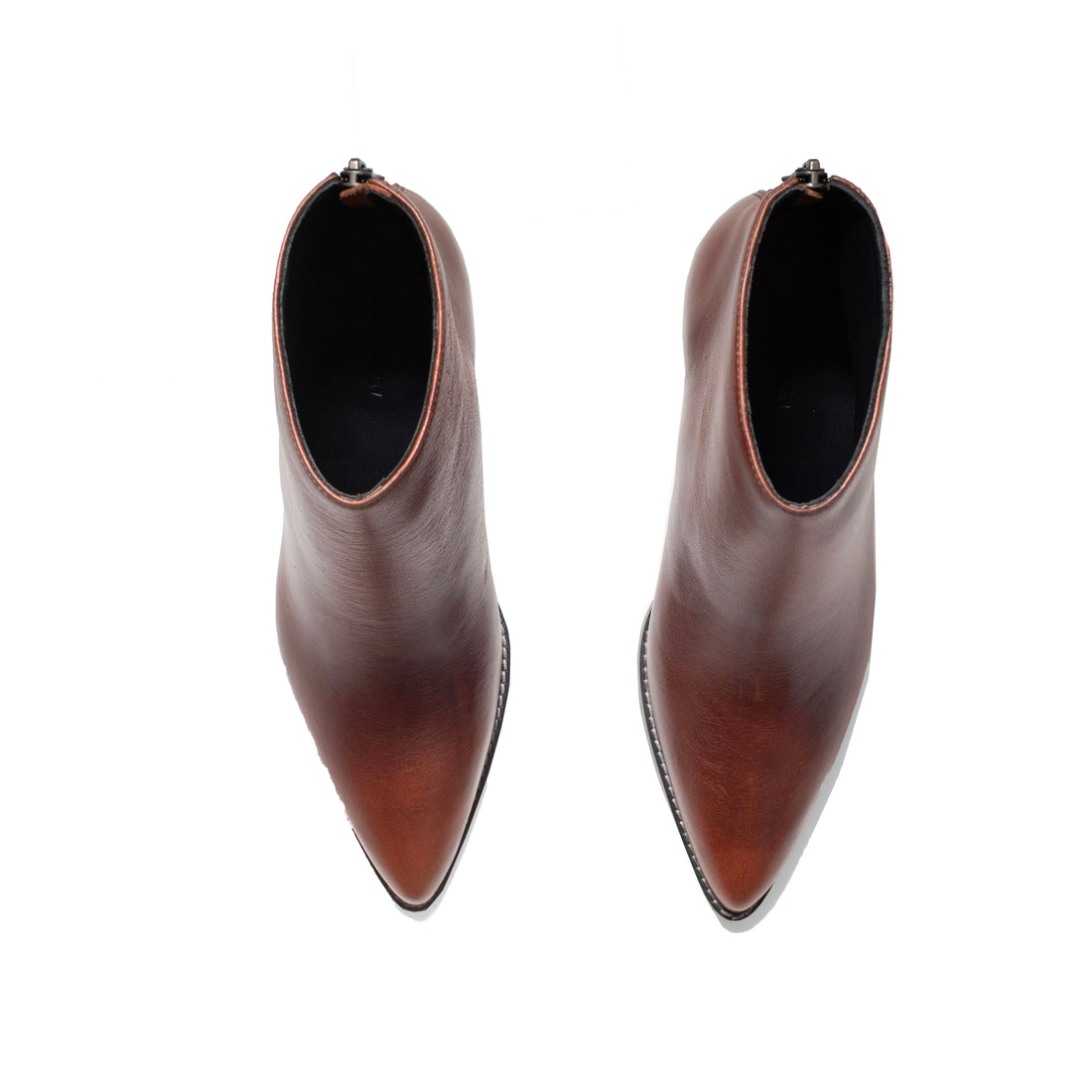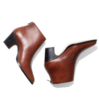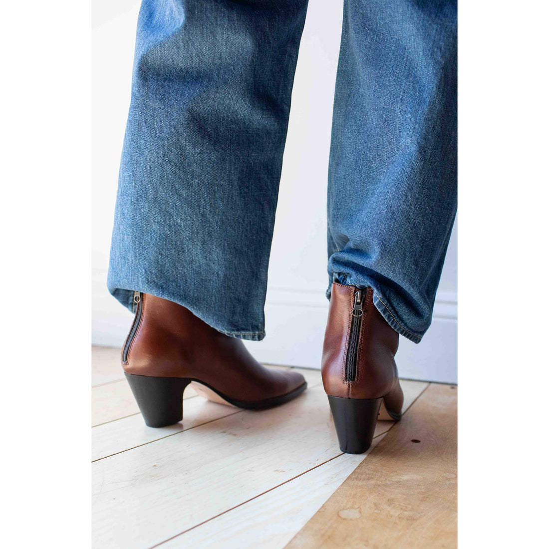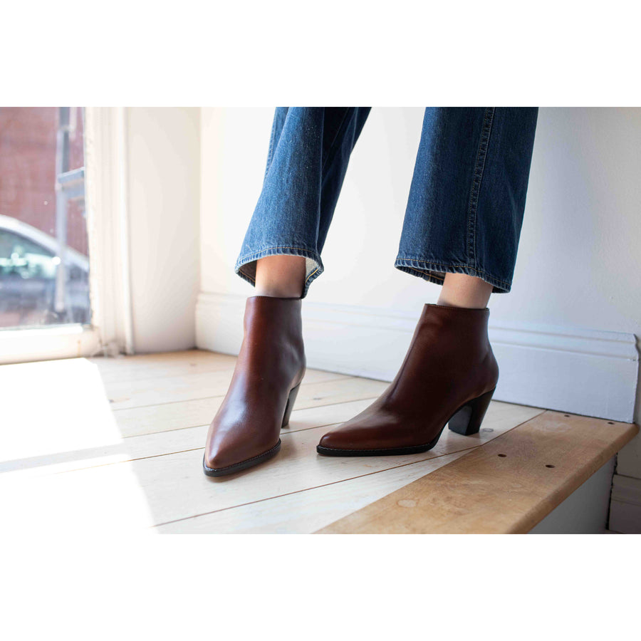 The Sonora Boot is a short-heeled boot in black nappa leather. Features a softly pointed toe, mid heel, and a hint of cowboy.