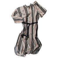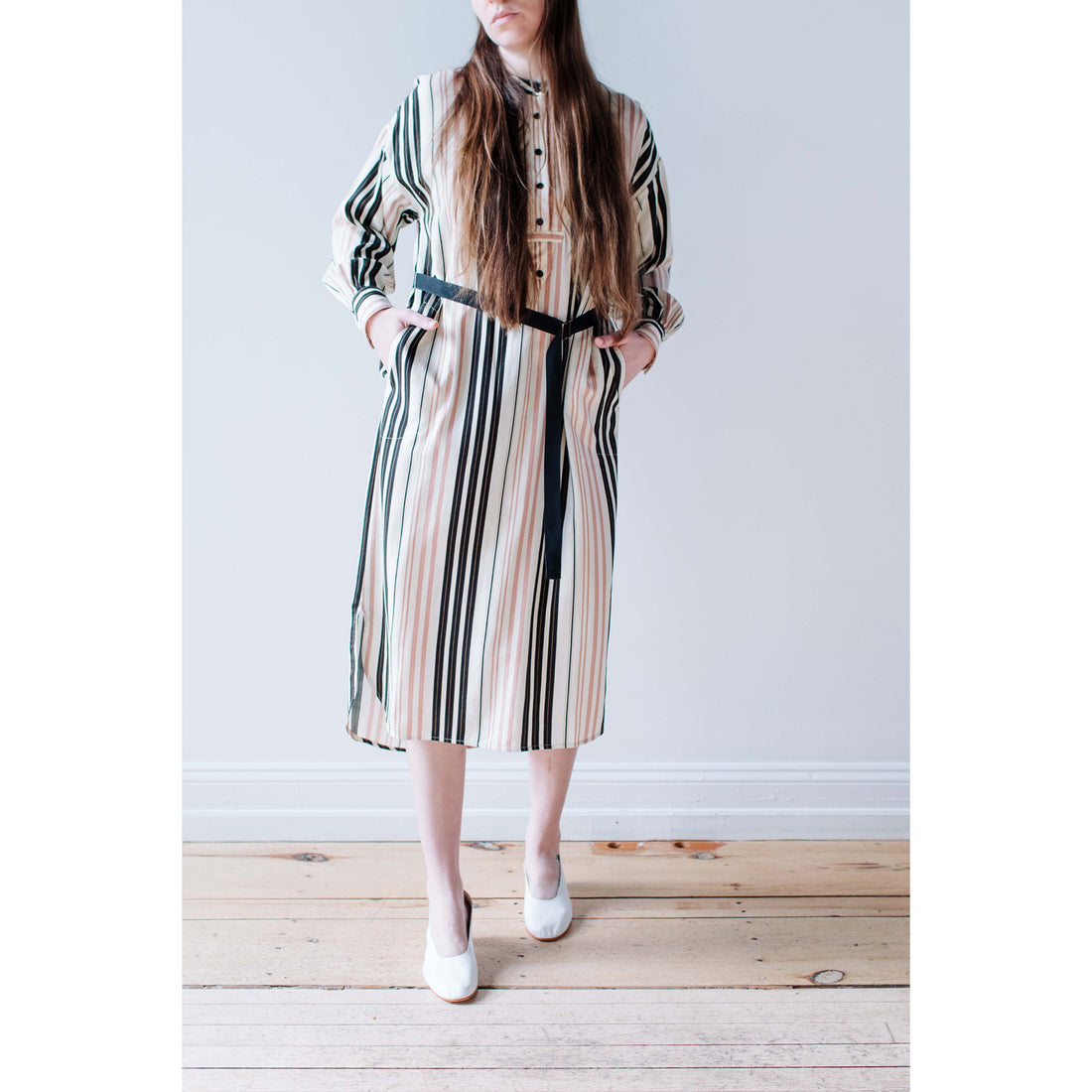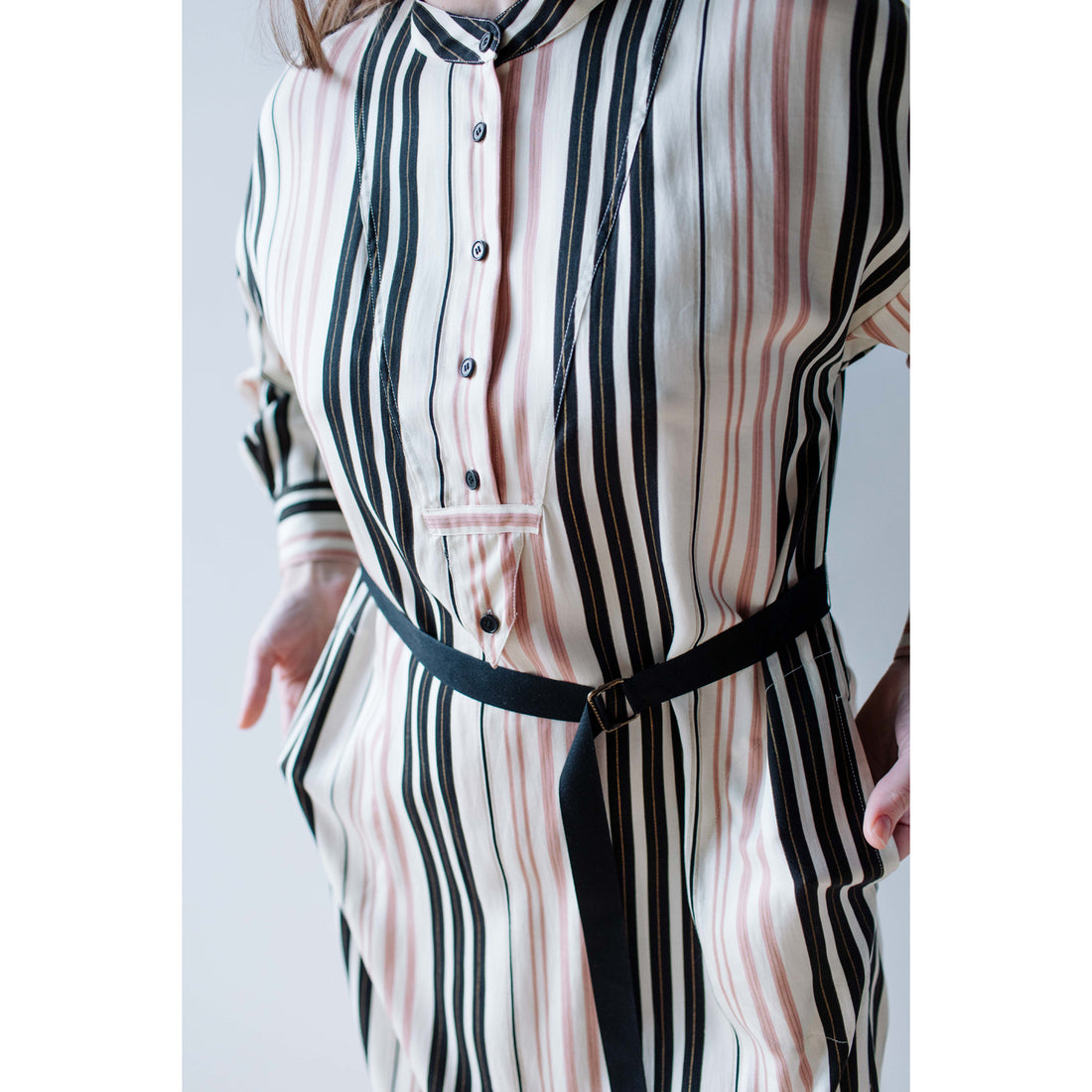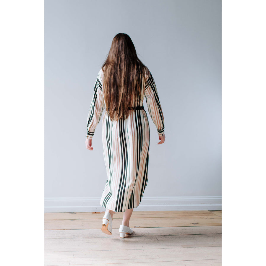 The Dinka Midi Dress is a pullover shirt dress with a henley placket, waist-cinched belt, and contrasting vertical stripe print.
