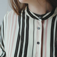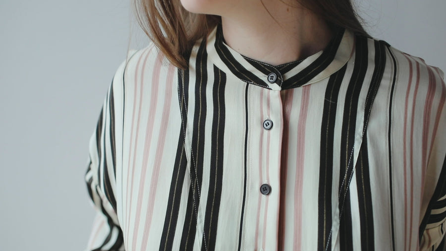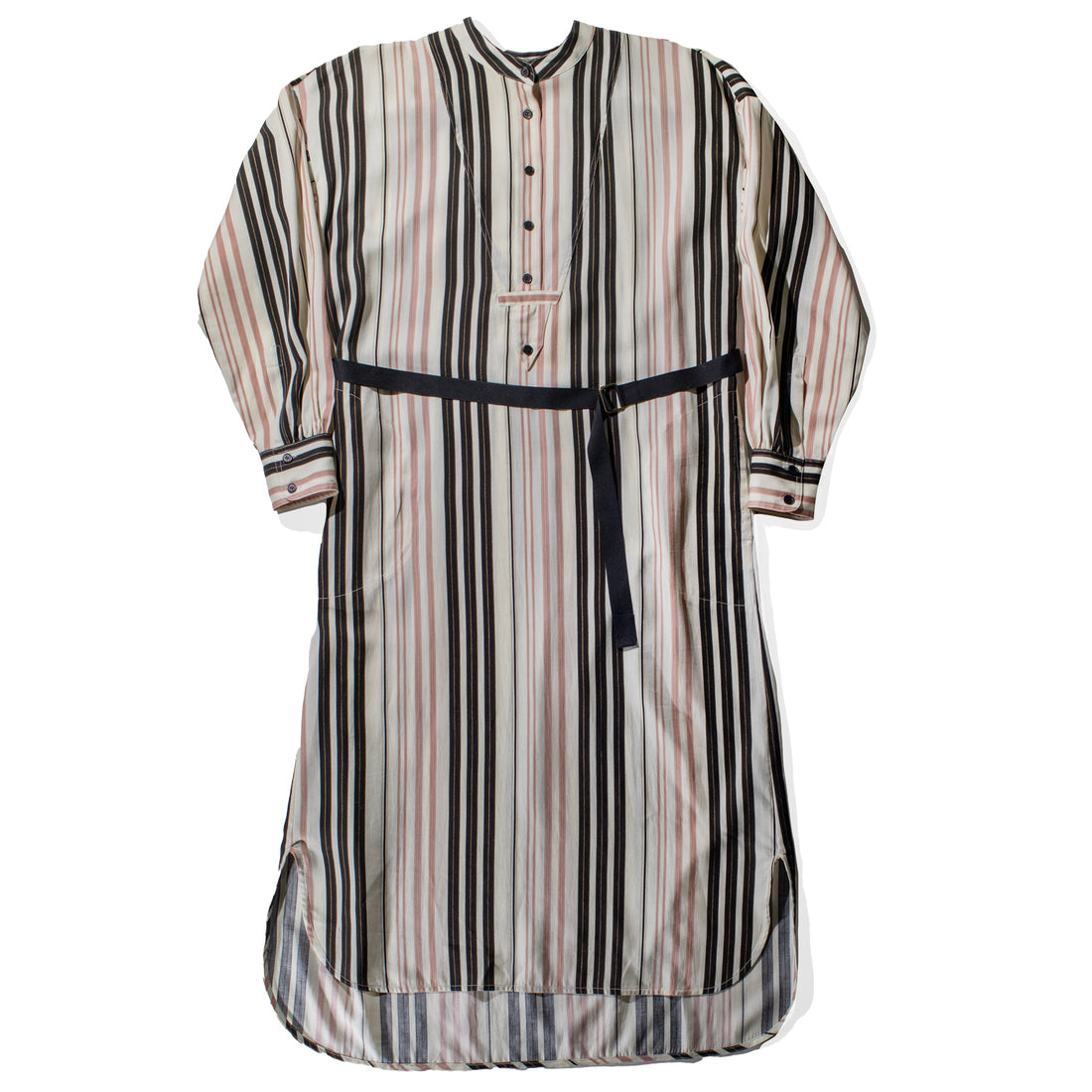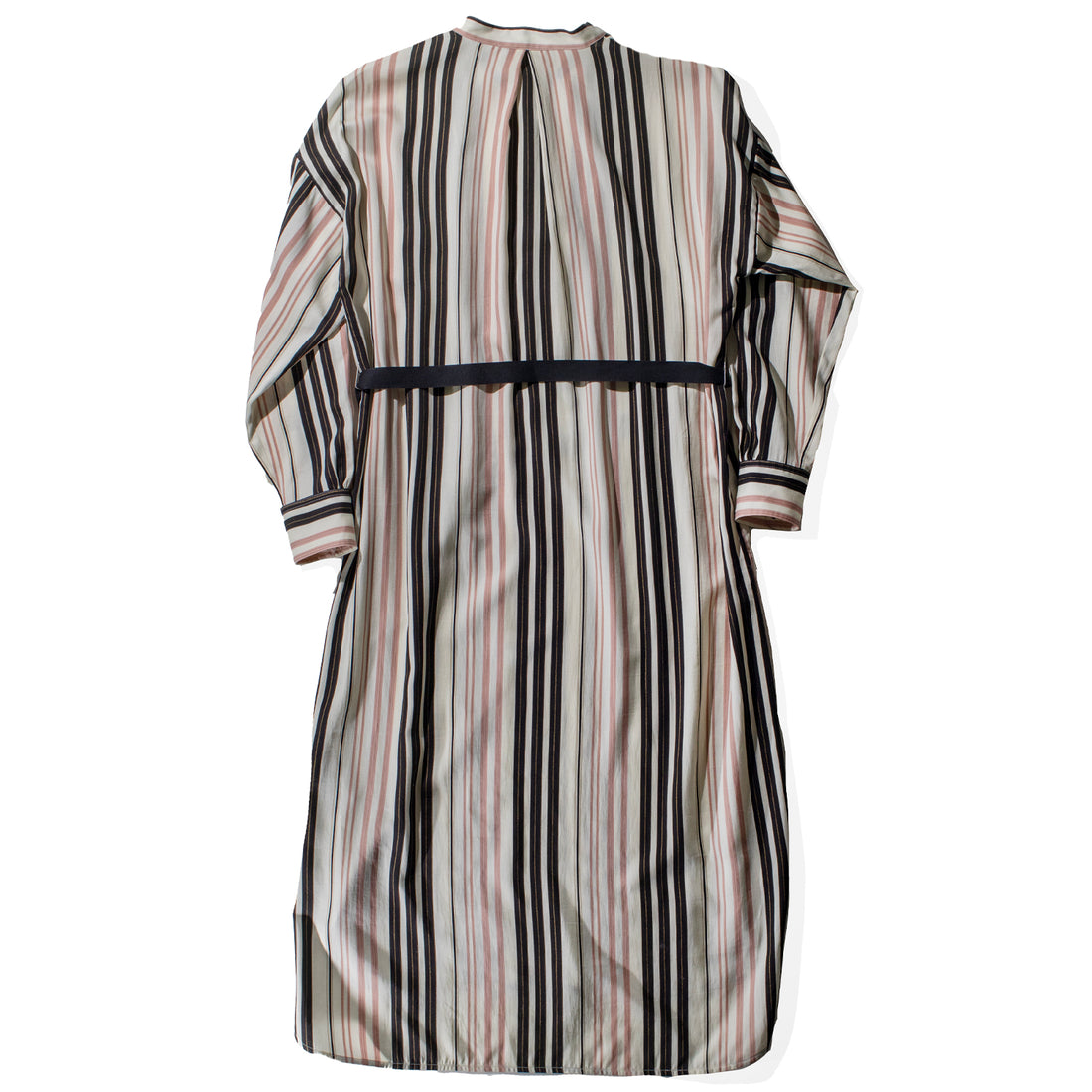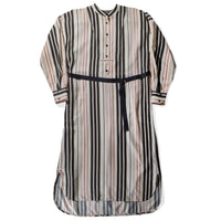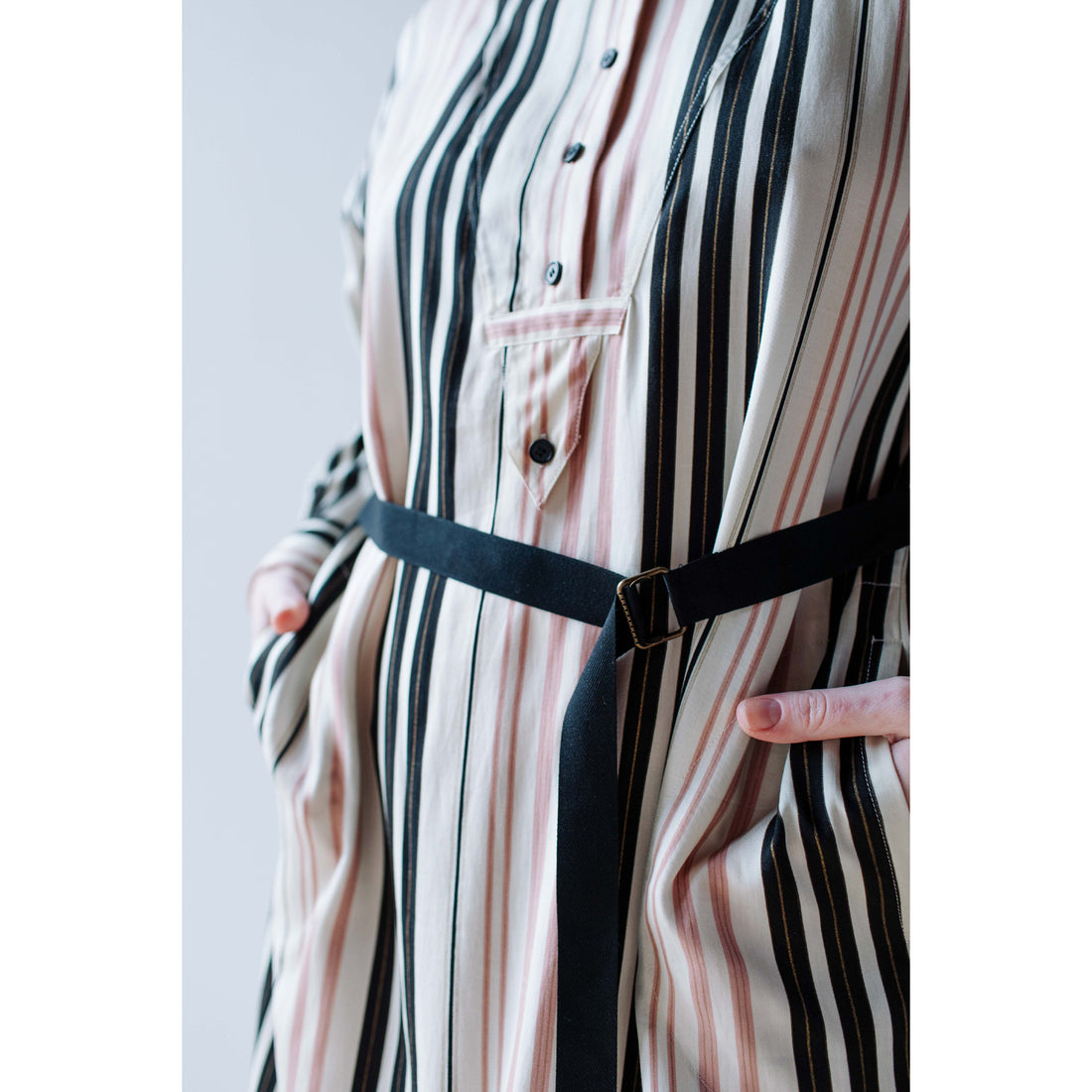 The Dinka Midi Dress is a pullover shirt dress with a henley placket, waist-cinched belt, and contrasting vertical stripe print.