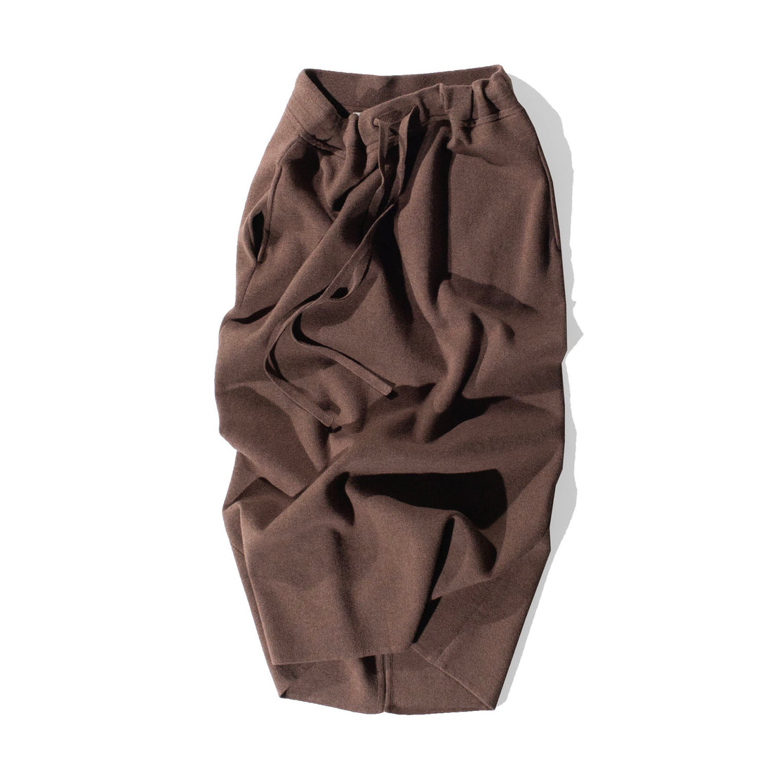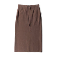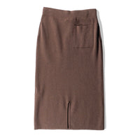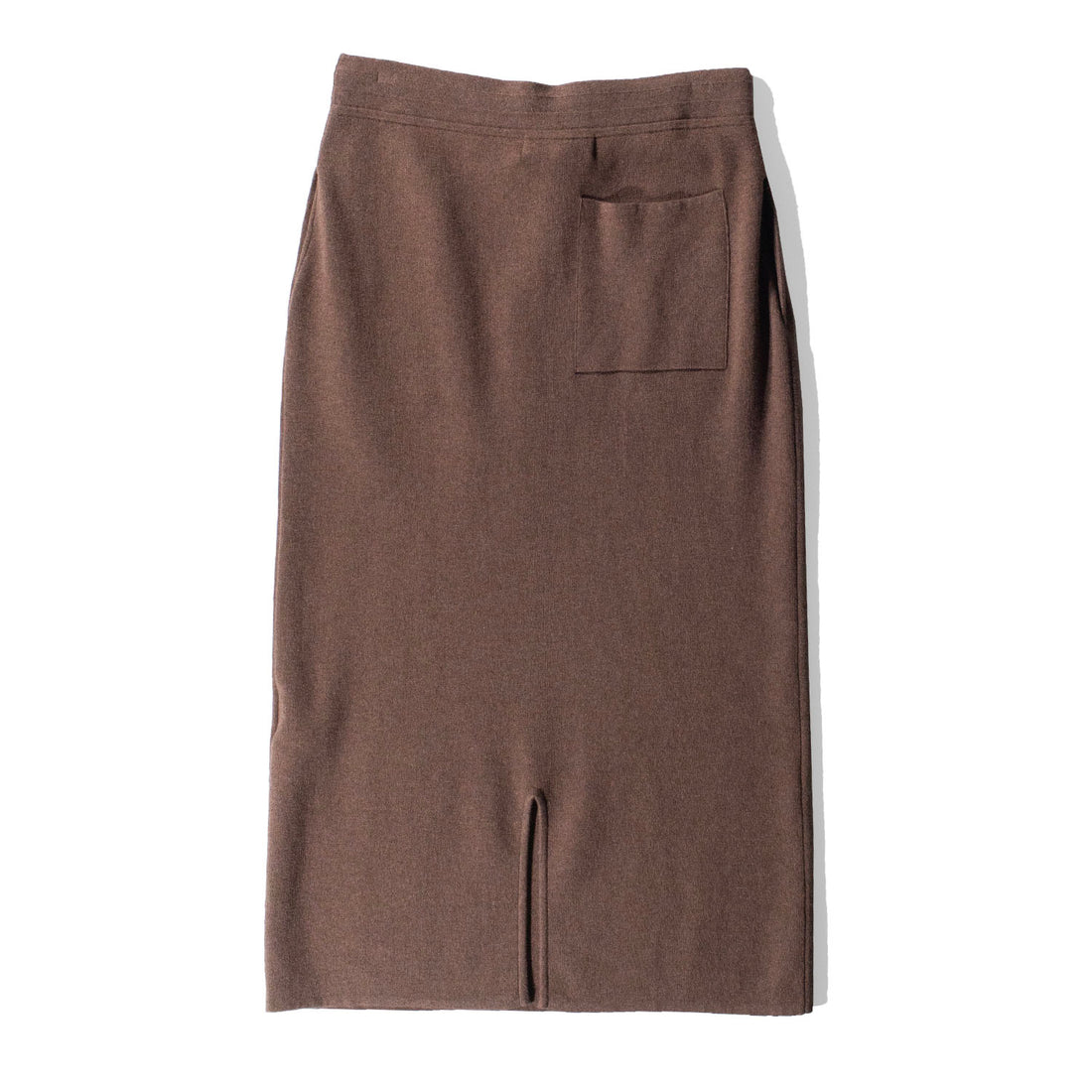 The Knit Skirt features a drawstring waistband, a back patch pocket, and a rear slit opening.