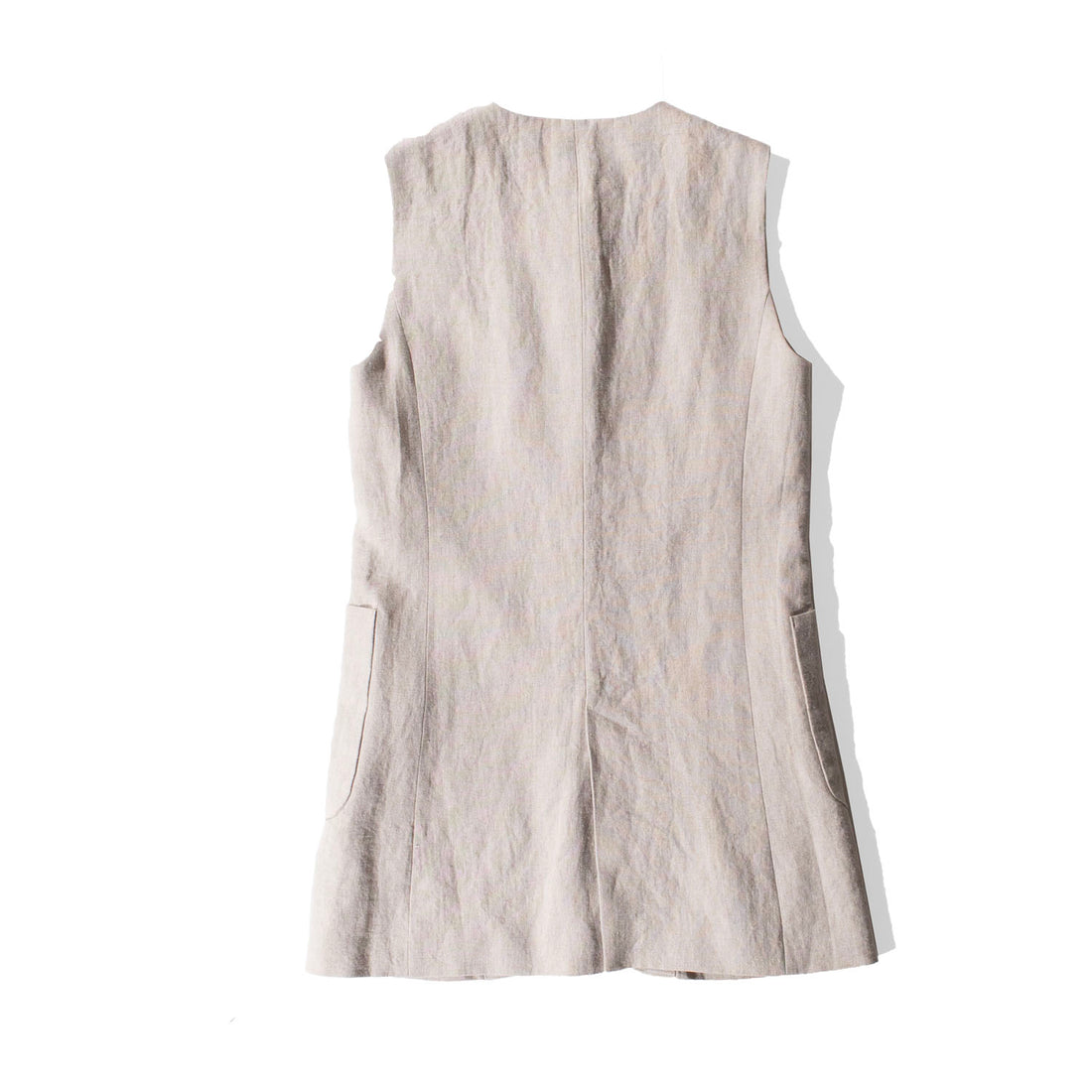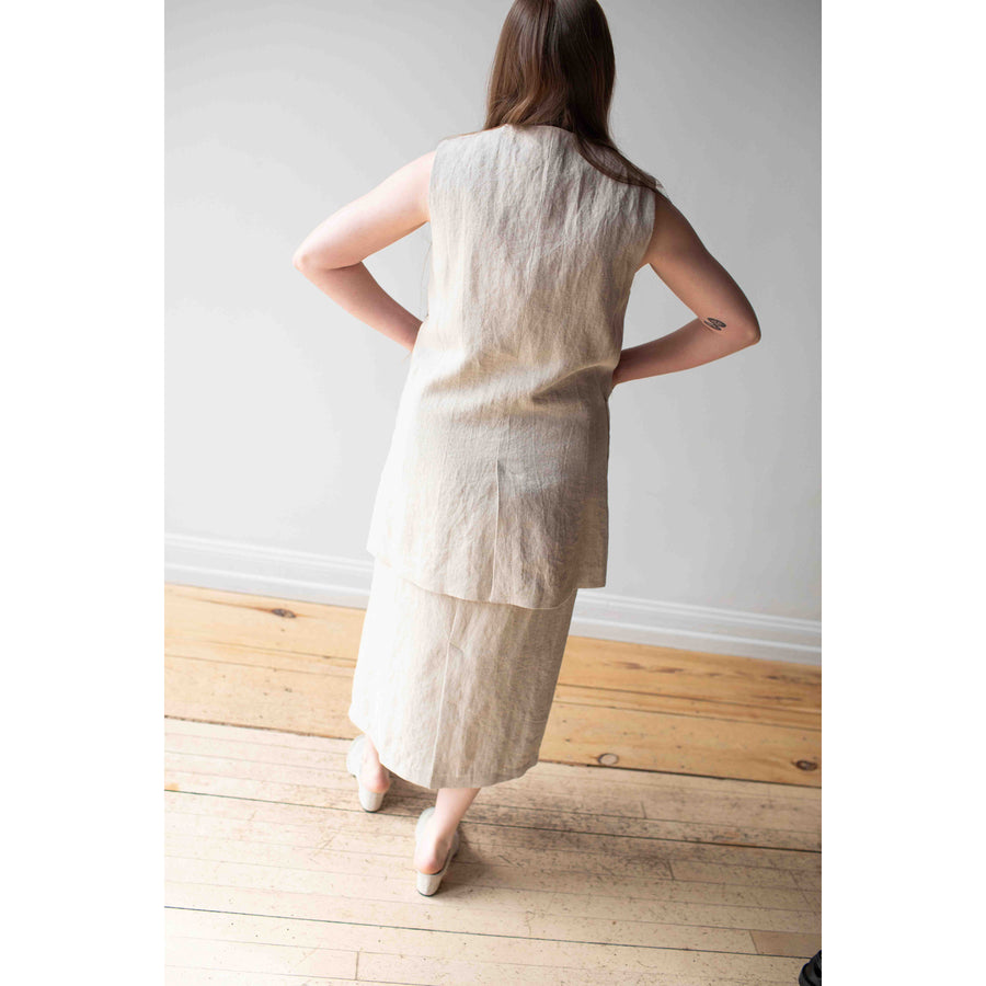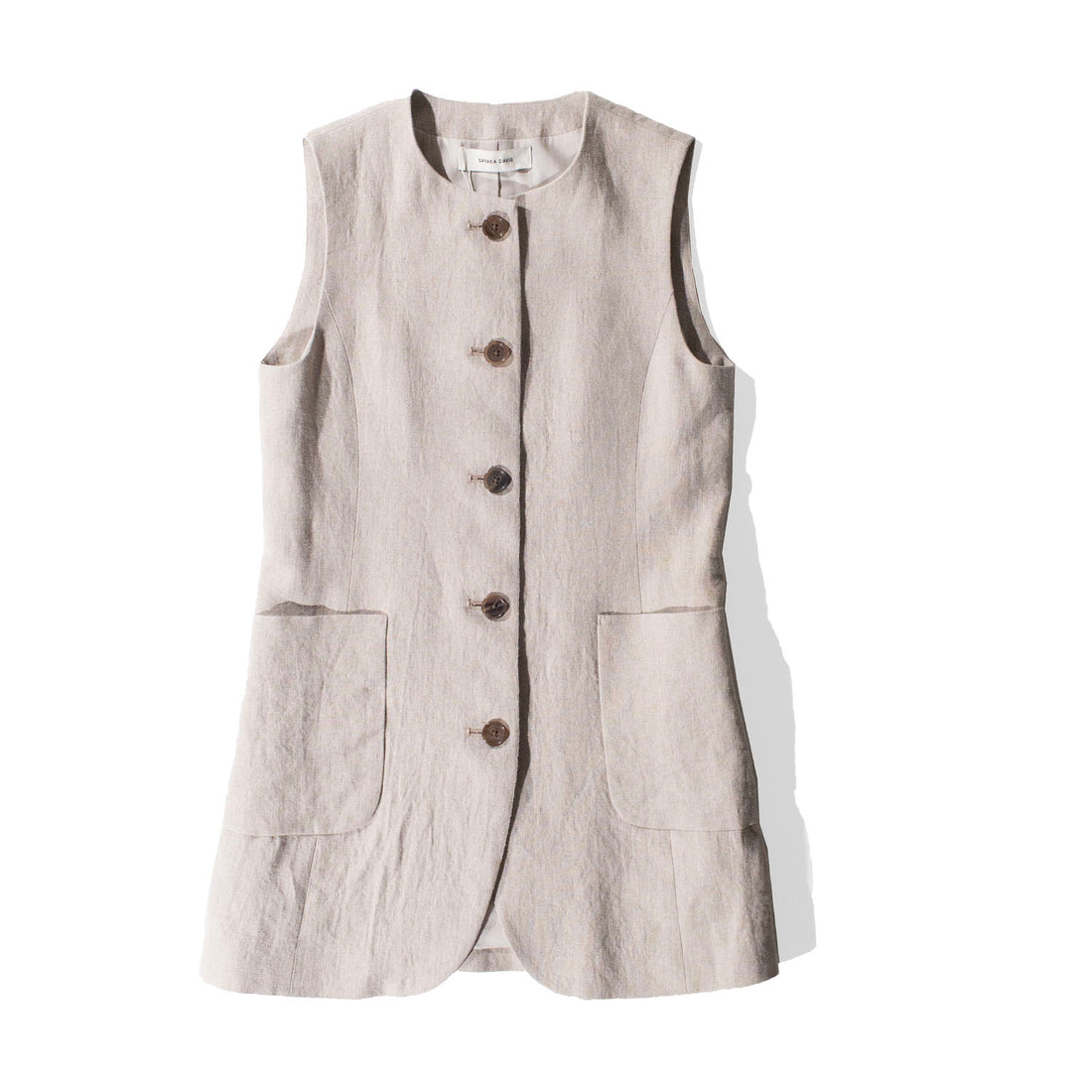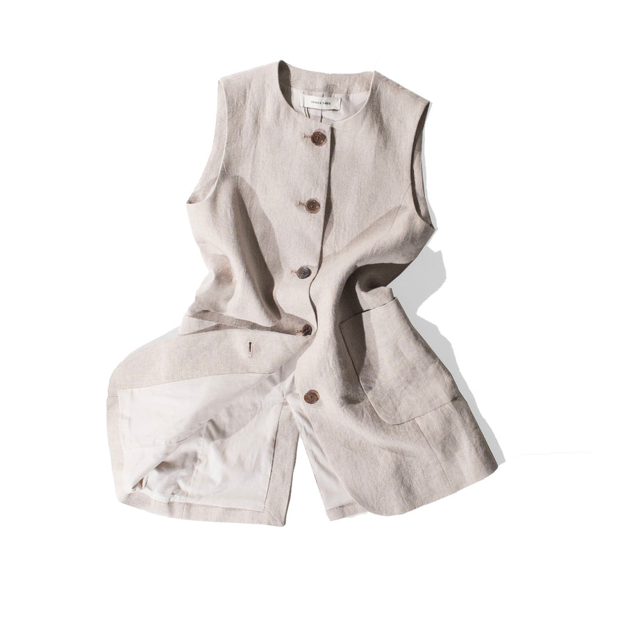 The Long Vest is a tunic-style layer with a button-front placket and two side pockets.