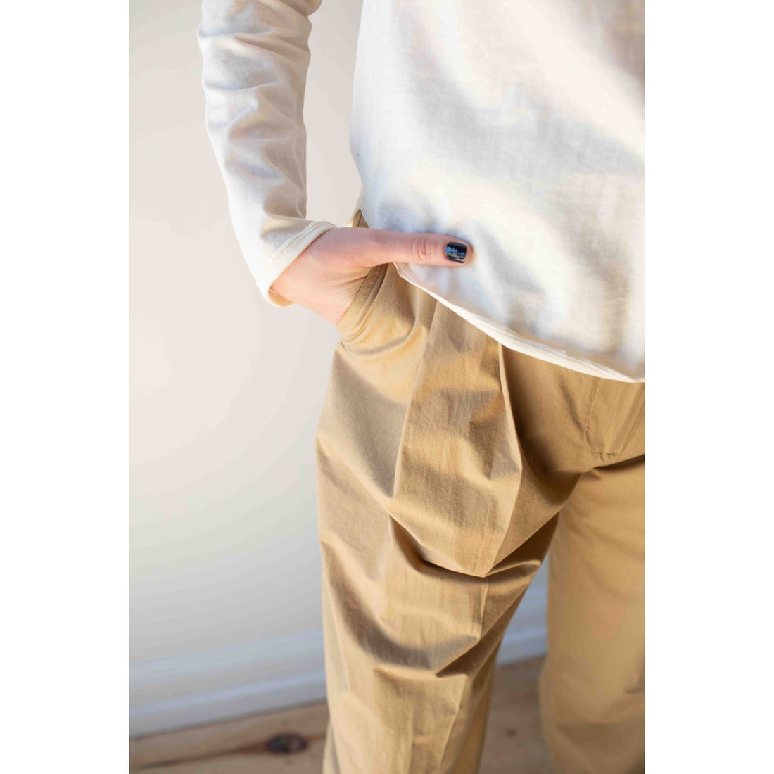 The Sperro Pant, offered this season in a typewriter cotton fabrication, features deep double pleats and a slight taper down the leg.